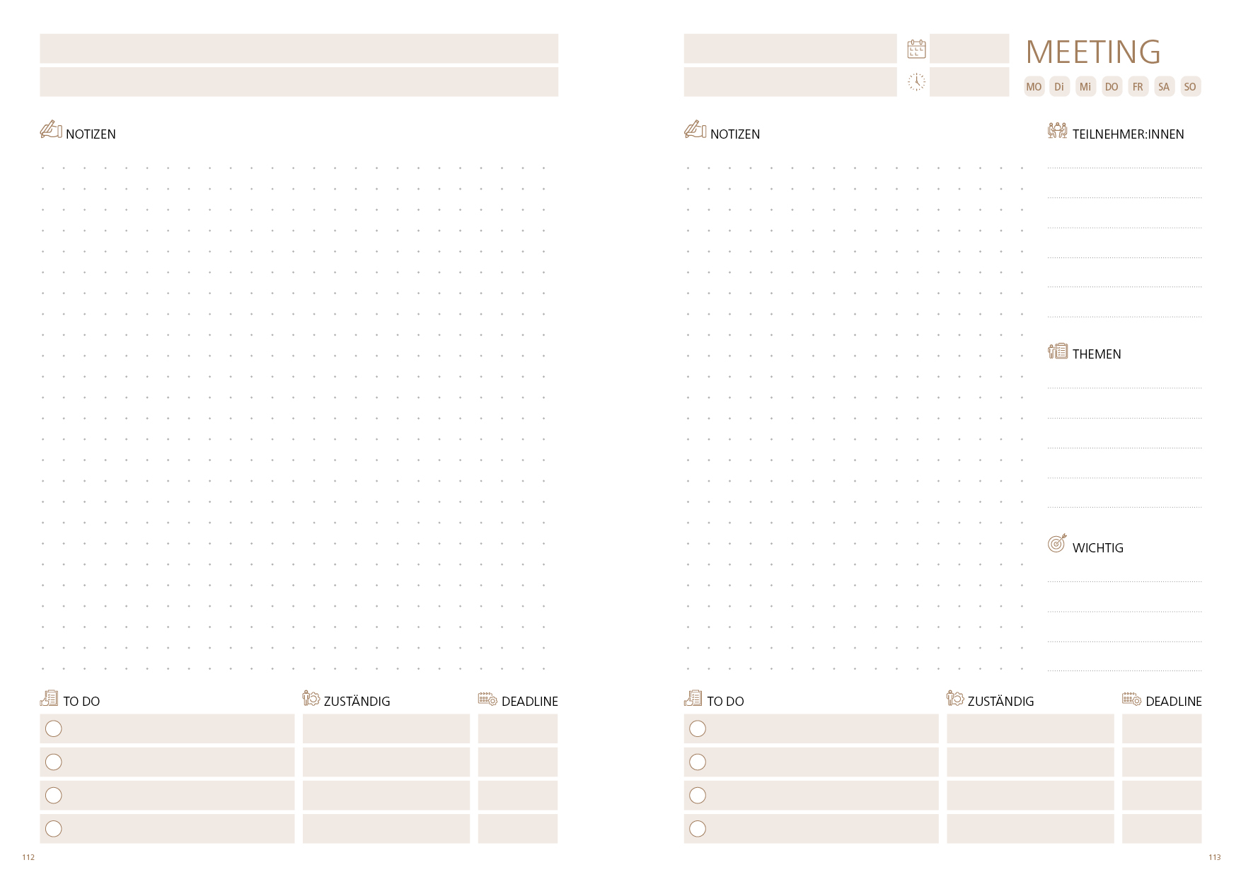 30 Seiten Besprechungsnotizen mit Punktraster, To-do-Liste, Teilnehmerliste, Themenliste und Prioritätenliste