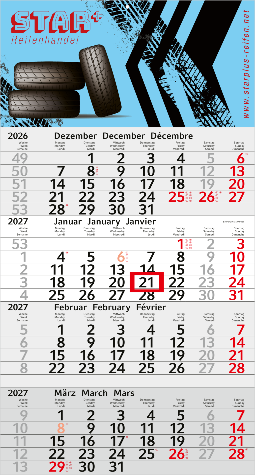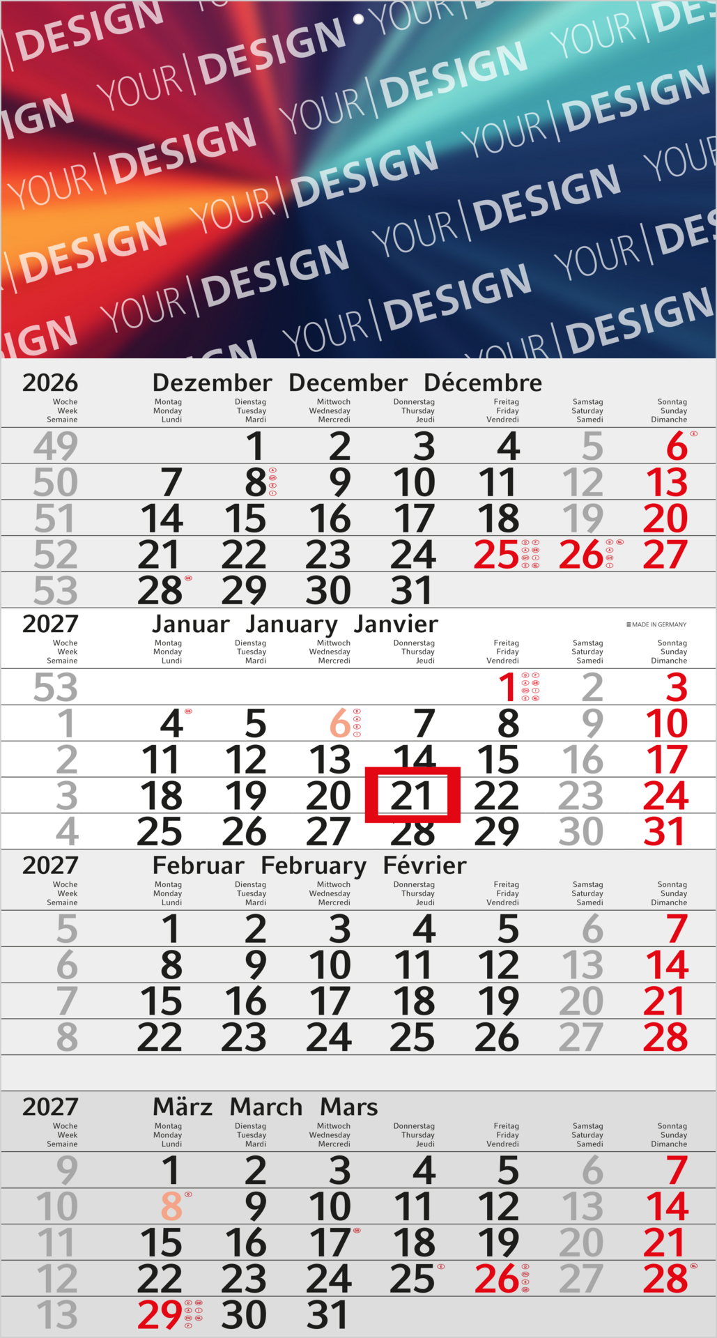 Der Budget 4 Bestseller bietet Übersicht und Funktionalität in einem kompakten Design. Mit seinem 4-Monatskalendarium, modernen Typografie und farbig hervorgehobenen Sonn- und Feiertagen sorgt er für eine klare Organisation. Die großzügige Werbefläche kann im hochwertigen 4C-Druck individuell gestaltet werden. „Made in Germany“, ist dieser Kalender ein ideales Werbemittel für Unternehmen.