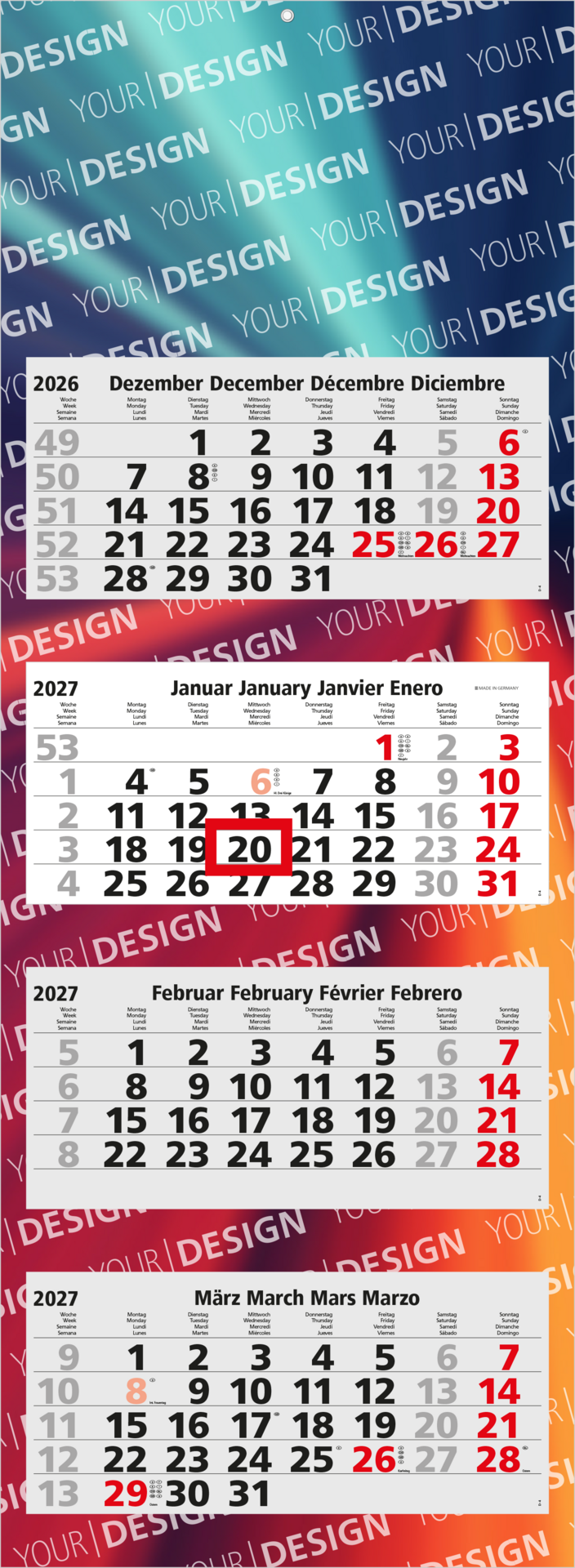 Der Quadro Light 4 Bestseller ist ein zeitloser Mehrblock-4-Monatskalender, der durch seine Funktionalität und klare Gestaltung überzeugt. Das mehrsprachige Kalendarium mit rot hervorgehobenen Sonn- und Feiertagen bietet optimale Übersichtlichkeit. Die perforierten Kalenderblöcke und die gerillte Rückwand ermöglichen eine portooptimierte Versendung. Die großzügige Werbefläche auf der gesamten Rückwand kann individuell im hochwertigen 4C-Druck gestaltet werden. „Made in Germany“ – bewährte Qualität, die überzeugt.