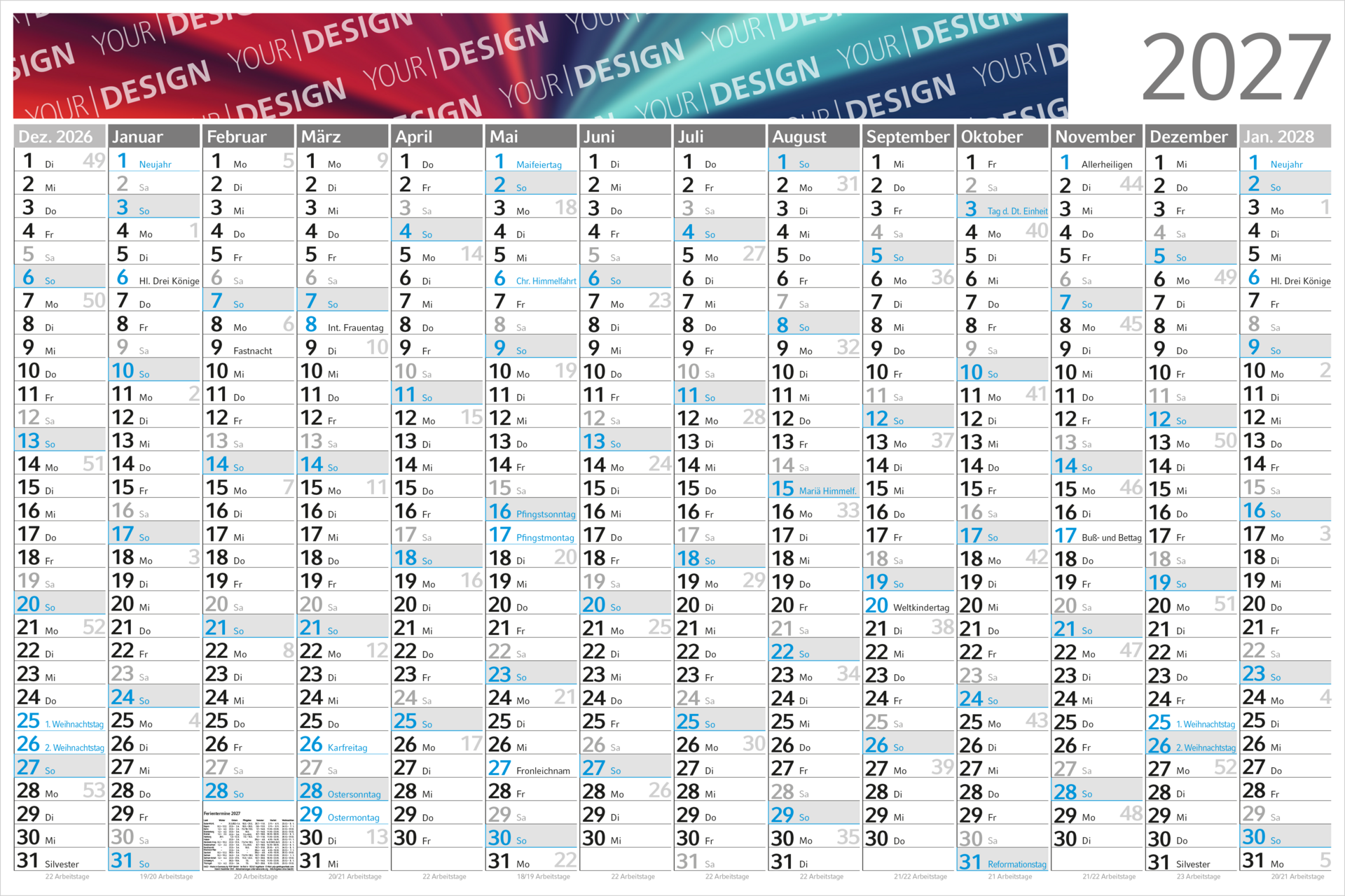 Der Wandplaner Horizont Bestseller ist ein klassisches Organisationsmittel für Büro und Betrieb. Gefertigt aus stabilem weißem Karton, überzeugt er durch seine klare Darstellung und eine langlebige Verarbeitung. Das Kalendarium ist einsprachig, deutsch und umfasst den Zeitraum von Dezember des Vorjahres bis zum Jahresanfang des Folgejahres. Sonn- und Feiertage sind farbig hervorgehoben, wodurch eine schnelle Orientierung ermöglicht wird. Der hochwertige 4C-Druck (CMYK) sorgt für eine kontrastreiche, gut lesbare Darstellung. Mit der dezenten anthrazitfarbenen Jahreszahl und der übersichtlichen Struktur ist der Planer auf Funktionalität und Alltagstauglichkeit ausgelegt. Gefertigt in Deutschland steht er für verlässliche Qualität und gleichbleibende Verfügbarkeit.