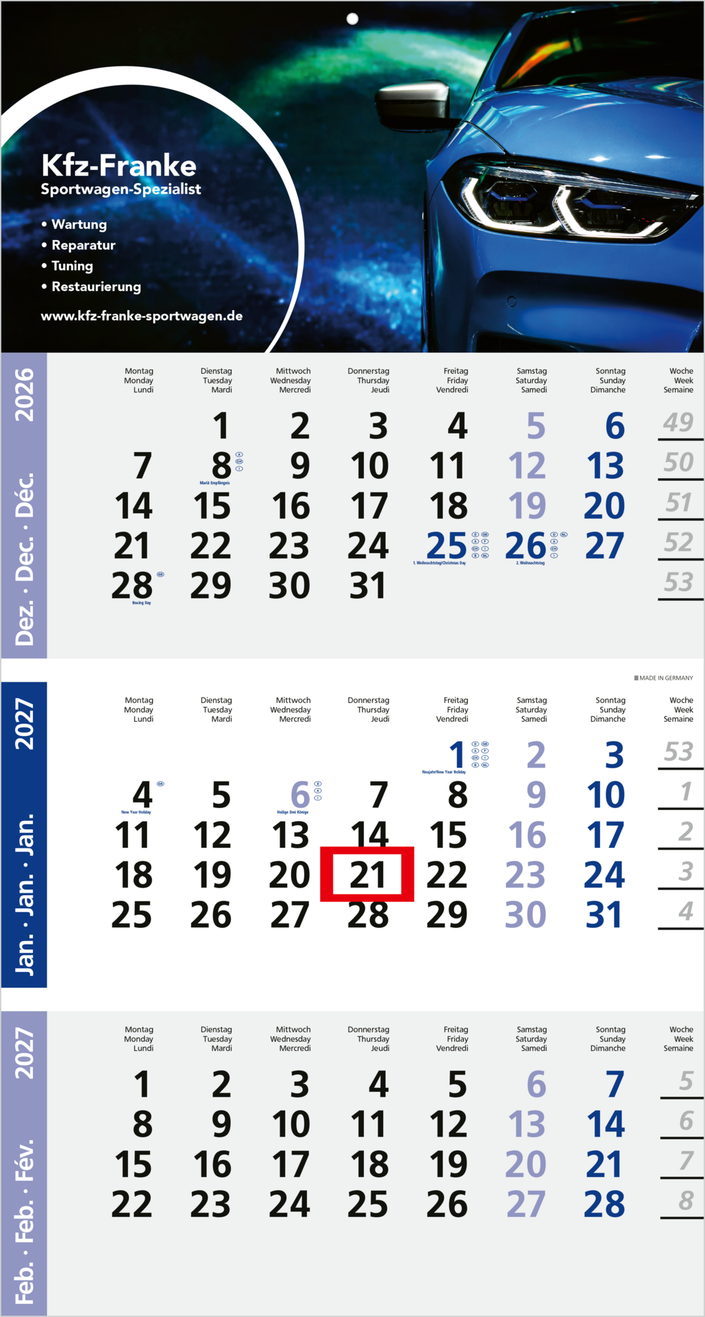 Der Einblatt-3-Monatskalender Logic 3 Post A Bestseller ist ein bewährter Organisations- und Werbekalender für den professionellen Einsatz. Er kombiniert übersichtliche Terminplanung mit wirtschaftlicher Versandoptimierung. Das Design-Kalendarium zeigt drei Monate auf einen Blick und ist dreisprachig in Deutsch, Englisch und Französisch ausgeführt. Sonn- und Feiertage sind blau hervorgehoben, der rote Datumsschieber erleichtert die Orientierung im Tagesgeschäft. Dank der gerillten Rückwand lässt sich der Kalender portooptimiert versenden. Die integrierte Werbefläche am Kopf bietet ausreichend Platz für individuelle Markenbotschaften. Der 4C-Quality-Druck ist im Komplettpreis bereits enthalten und macht den Logic 3 ideal für den Einsatz als Mailing- oder Streuartikel.