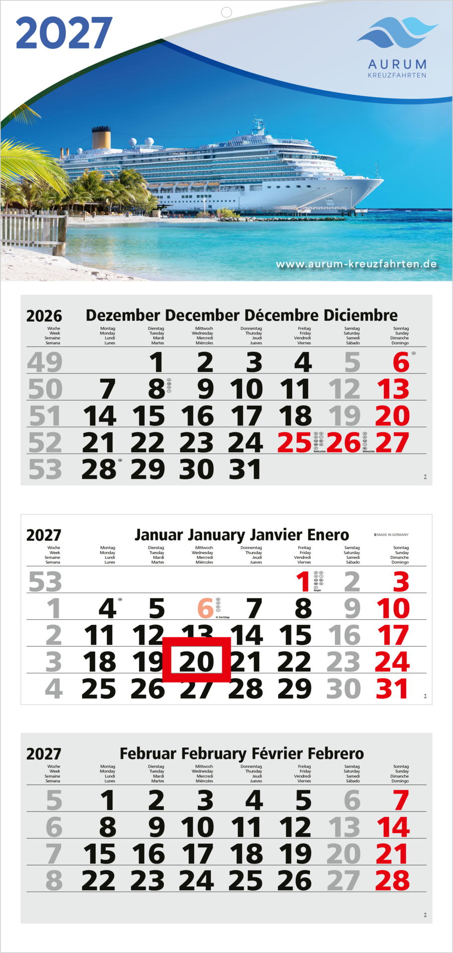 Der Medium Light 3 Bestseller bietet eine preiswerte Lösung für Unternehmen, die einen funktionalen und werbewirksamen 3-Monatskalender suchen. Mit einer großzügigen Werbefläche am Kopf und einem klaren viersprachigen Kalendarium kombiniert dieser Kalender Funktionalität und Markenpräsenz. Die portooptimierte Verarbeitung und der hochwertige 4C-Druck machen ihn zu einem perfekten Werbemittel. „Made in Germany“, überzeugt er durch Qualität und Effizienz.