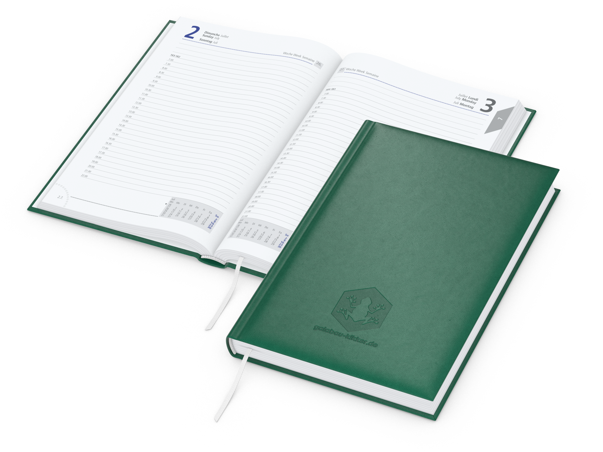 Der Buchkalender Manager ist das Premium-Modell für professionelle Terminplanung. Im praktischen DIN-A5-Format (148 × 210 mm) und mit 416 Seiten bietet er eine Seite pro Tag, einschließlich Samstag und Sonntag. Vor jedem Monat erleichtert eine Monatsübersicht die Planung. Das deutschsprachige Kalendarium (3sprachig D/GB/F) ist klar strukturiert und hebt Sonn- und Feiertage in Blau (PMS 286) hervor. Mit Halbstunden-Einteilungen von 7 bis 22 Uhr und einem umfassenden Informationsteil wird der Kalender höchsten Ansprüchen gerecht. Der wattierte Hardcover-Einband, kombiniert mit rundem Rücken, Eckenperforation, Lesezeichen und Kapitalband, sorgt für eine elegante Optik und hervorragende Funktionalität. Dank verschiedener Einbandmaterialien und Veredelungsoptionen kann der Kalender individuell an die Marke angepasst werden. Ein stilvolles und repräsentatives Werbemittel – „Made in Germany“.