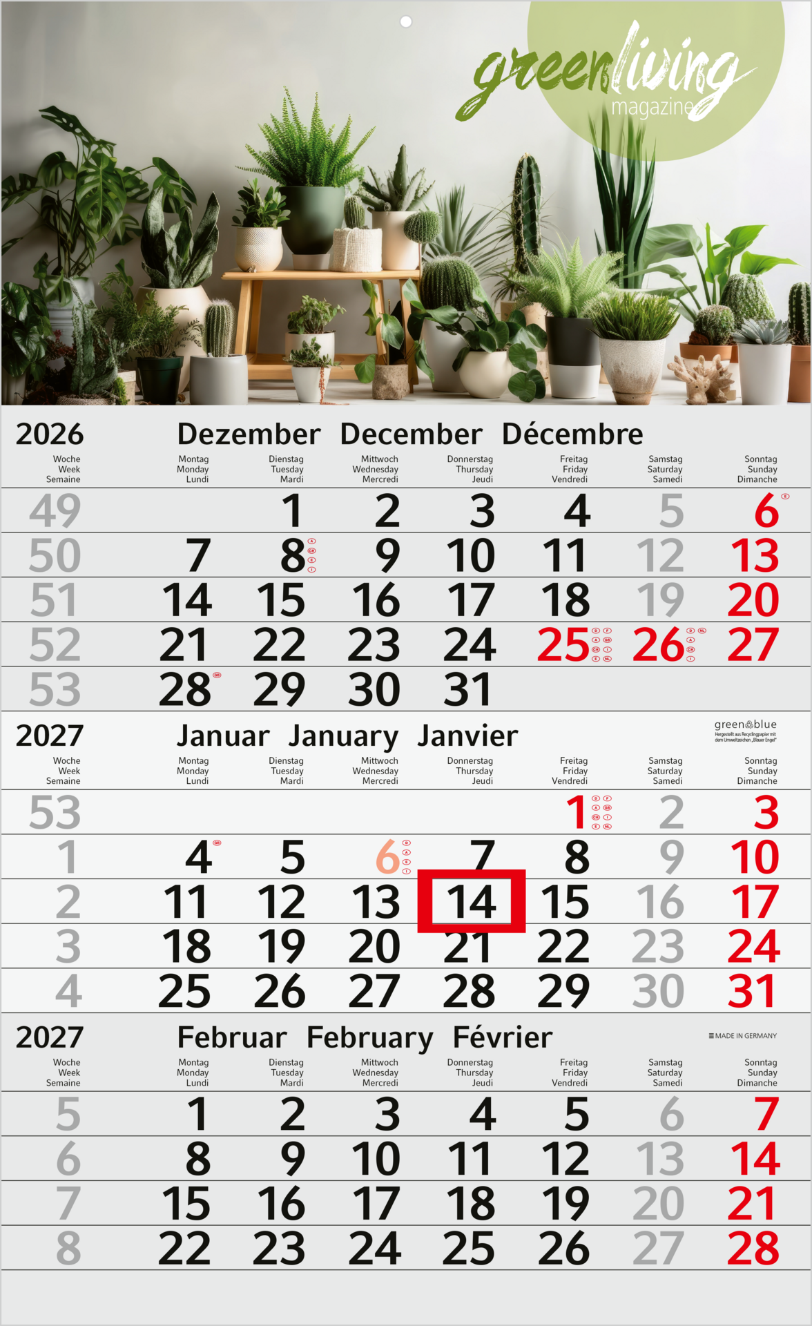 Der Budget 3 green+blue ist die nachhaltige Wahl unter den 3-Monatskalendern. Mit seinem Kalendarium aus Recyclingpapier, ausgezeichnet mit dem Umweltzeichen „Blauer Engel“, vereint er Umweltbewusstsein mit Funktionalität. Das moderne Kalendarium, ergänzt durch einen roten Datumsschieber, sorgt für Übersichtlichkeit. Die Werbefläche kann individuell im 4C-Druck gestaltet werden. Perfekt für Unternehmen, die Wert auf Nachhaltigkeit legen.