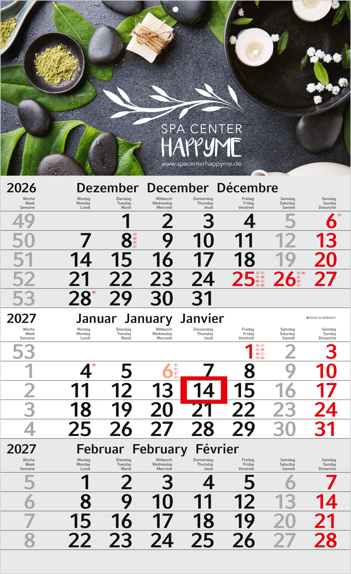 Der Budget 3 ist ein bewährtes Einstiegsmodell unter den 3-Monatskalendern. Mit moderner Typografie, farbig hervorgehobenen Sonn- und Feiertagen und einem roten Datumsschieber sorgt er für eine klare und übersichtliche Monatsorganisation. Die großzügige Werbefläche kann individuell im Offset- oder Druck gestaltet werden. Hergestellt in Deutschland, bietet dieser Kalender Qualität und Funktionalität zu einem besonders attraktiven Preis.