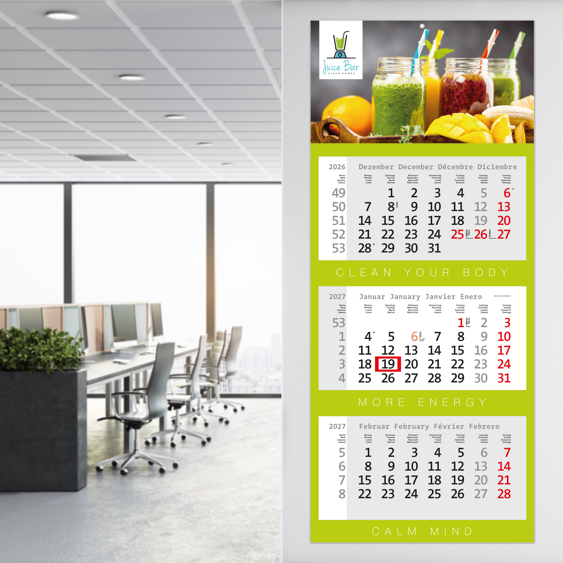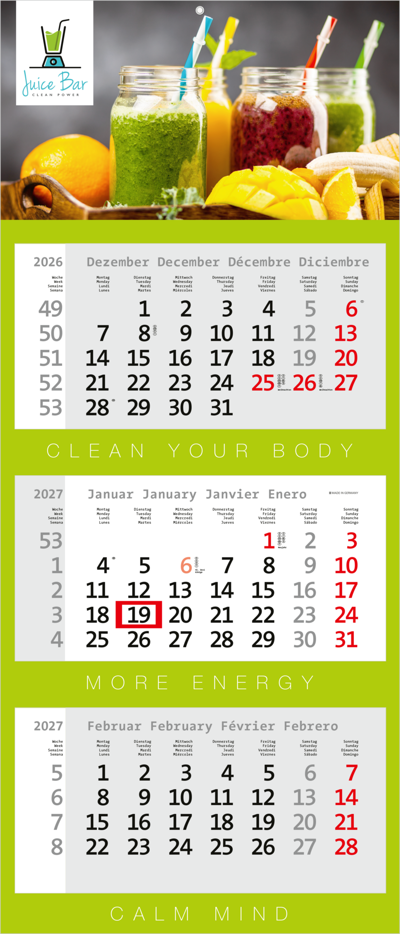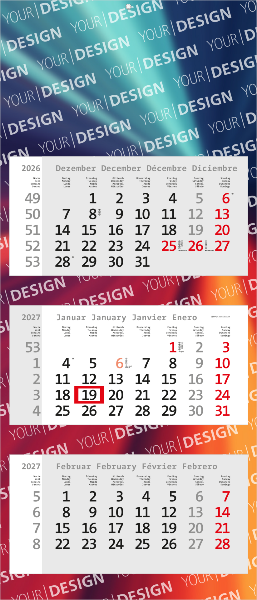 Der Centrum 3 kombiniert modernes Design mit bewährter Funktionalität. Mit seinem farbigen mehrsprachigen Kalendarium und einer großzügigen Werbefläche ist dieser 3-Monatskalender die ideale Wahl für Unternehmen, die Wert auf Ästhetik und praktische Werbewirkung legen. Dank hochwertigem Druck und portooptimierter Verarbeitung ist der Kalender flexibel einsetzbar und vielseitig anpassbar. „Made in Germany“ – für Qualität und Zuverlässigkeit.