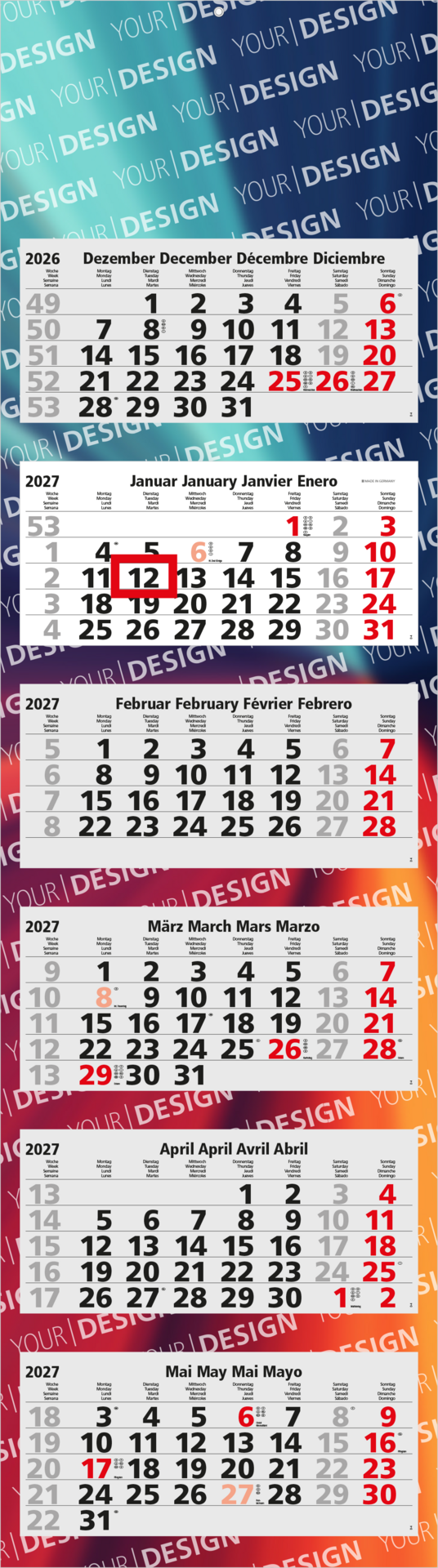 Der Hexa Light 6 ist der größte Mehrblockkalender in der Reihe, ideal für eine klare Übersicht über 6 Monate und eine maximale Werbewirkung. Mit seinem klassischen Aufbau, einer großzügigen Werbefläche und einer hochwertigen Verarbeitung bietet dieser 6-Monatskalender alles, was für eine effektive Markenpräsenz erforderlich ist. „Made in Germany“ – für Qualität, Funktionalität und Flexibilität.
