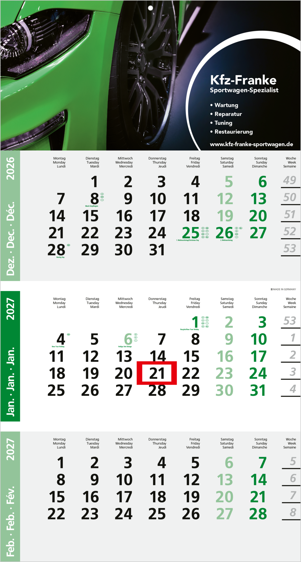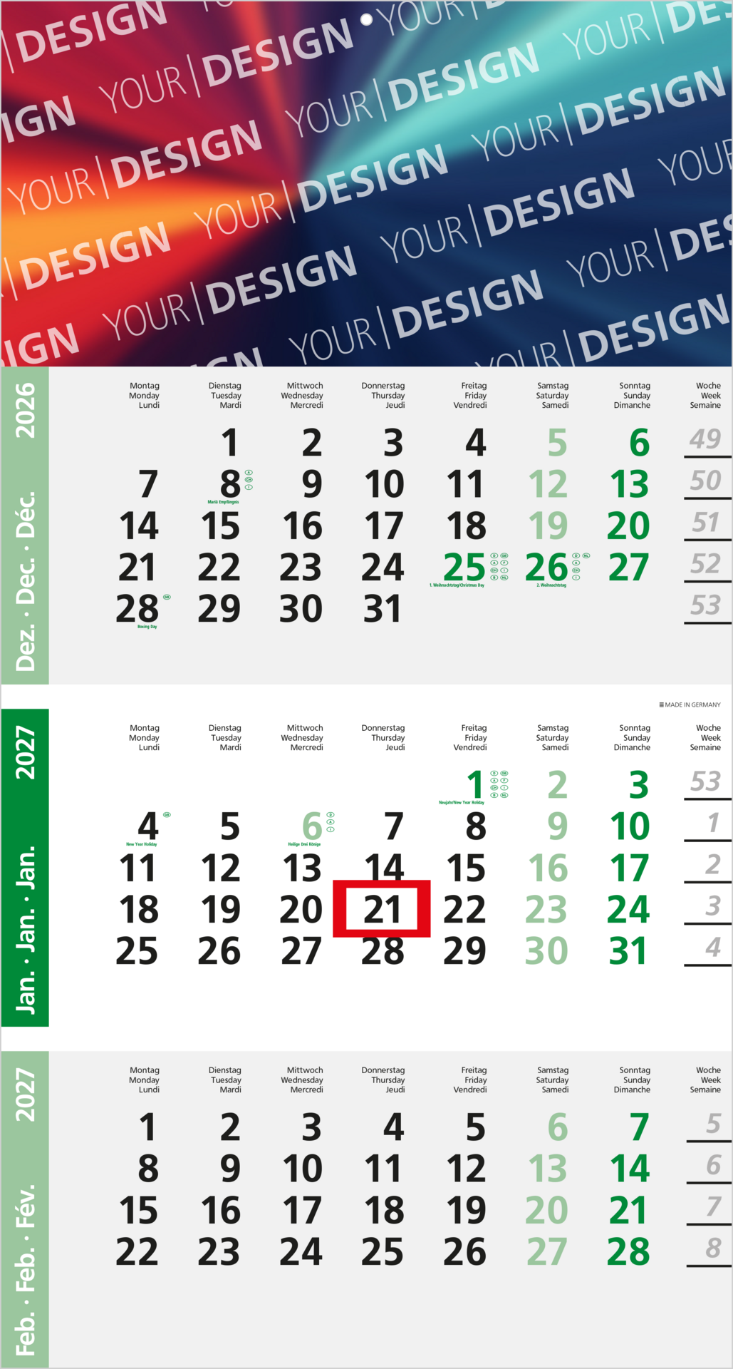 Der Logic 3 Post ist ein klassischer Einblatt-3-Monatskalender für den Einsatz als Werbekalender im professionellen Umfeld. Das übersichtliche Design-Kalendarium stellt drei Monate gleichzeitig dar und unterstützt eine strukturierte Terminplanung im Büro, in der Werkstatt oder im Servicebereich. Das Kalendarium ist farbig gestaltet, dreisprachig in Deutsch, Englisch und Französisch ausgeführt und hebt Sonn- sowie Feiertage deutlich hervor. Ein roter Datumsschieber ermöglicht eine schnelle Orientierung im laufenden Monat. Die klare Gestaltung in Hellgrau/Schwarz sorgt für gute Lesbarkeit – auch aus größerer Entfernung. Für den wirtschaftlichen Versand ist der Kalender portooptimiert ausgelegt: Die Rückwand ist zum Falten gerillt, die Kalenderblätter sind perforiert. Produziert in Deutschland, eignet sich der Logic 3 ideal als langlebiger Werbeträger für Unternehmen, die Wert auf Qualität und Funktionalität legen.