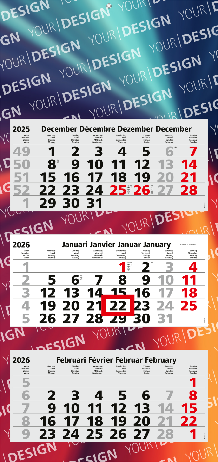 Der Maxi Light 3 Bestseller ist ein klassischer 3-Monatskalender, der durch klare Übersicht, hochwertige Verarbeitung und eine großzügige Werbefläche überzeugt. Mit seinem viersprachigen Kalendarium, der portooptimierten Rückwand und dem hochwertigen 4C-Digitaldruck bietet er Unternehmen eine effektive Möglichkeit, Markenbotschaften prominent zu platzieren. „Made in Germany“ – bewährte Qualität für höchste Ansprüche.