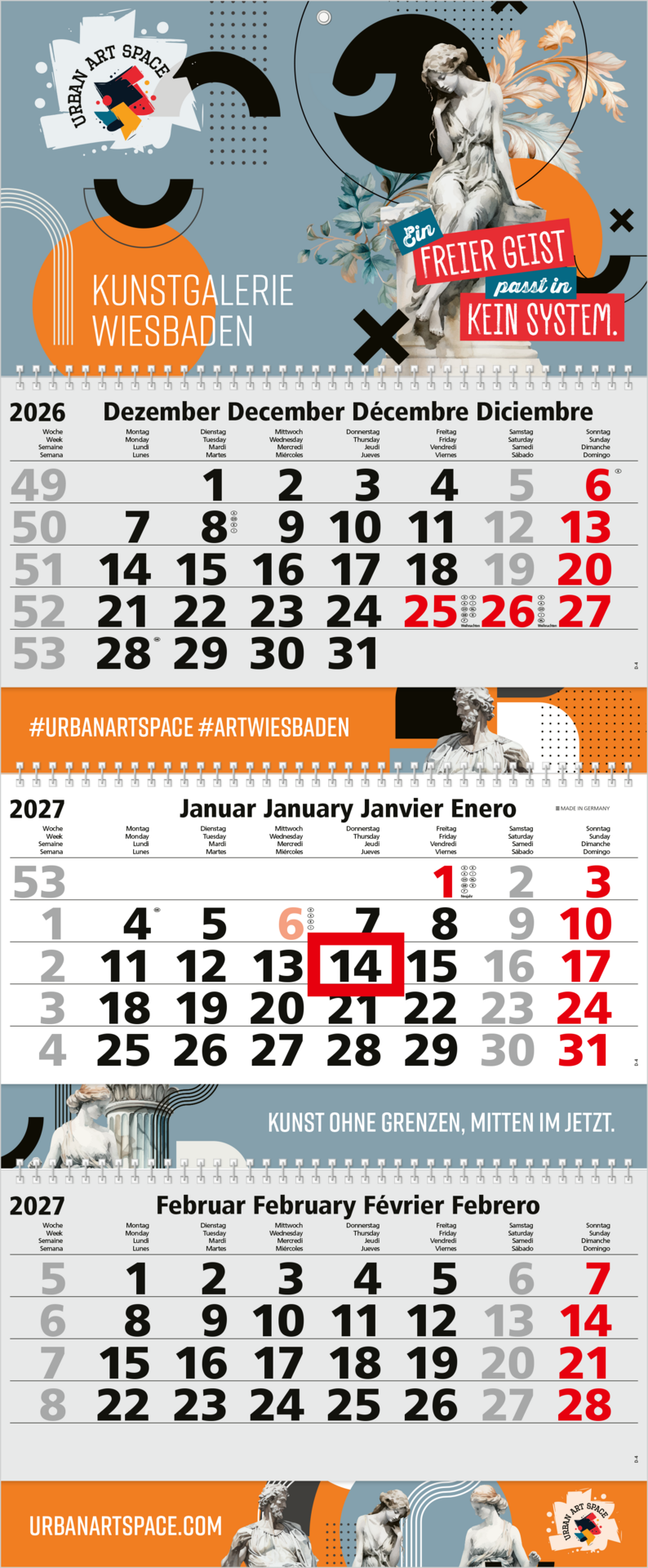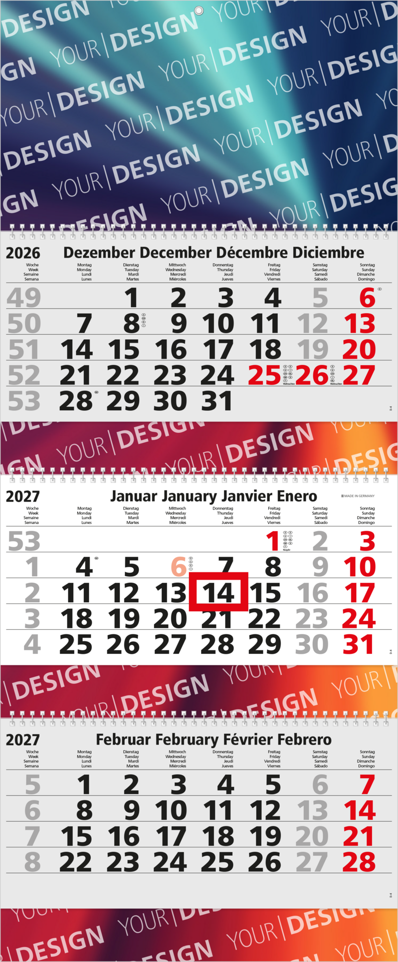 Der Maxi Wire-O 3 setzt mit seiner weißen Wire-O-Bindung, einem mehrsprachigen Kalendarium und der großzügigen Werbefläche neue Standards in der Kalendergestaltung. Sonn- und Feiertage werden farbig hervorgehoben, während die Werbeflächen an Kopfteil, Zwischenleisten und Fußleiste individuell im Offset- oder Druck gestaltet werden können. Dank der portooptimierten Rückwand und der stabilen Aufhängeöse aus Metall ist dieser Kalender ideal für den täglichen Einsatz und Werbeauftritte. Sonderoptionen wie farbige Wire-O-Bindungen und Datumsschieber machen den Maxi Wire-O 3 noch flexibler. „Made in Germany“ – Qualität, die überzeugt.
