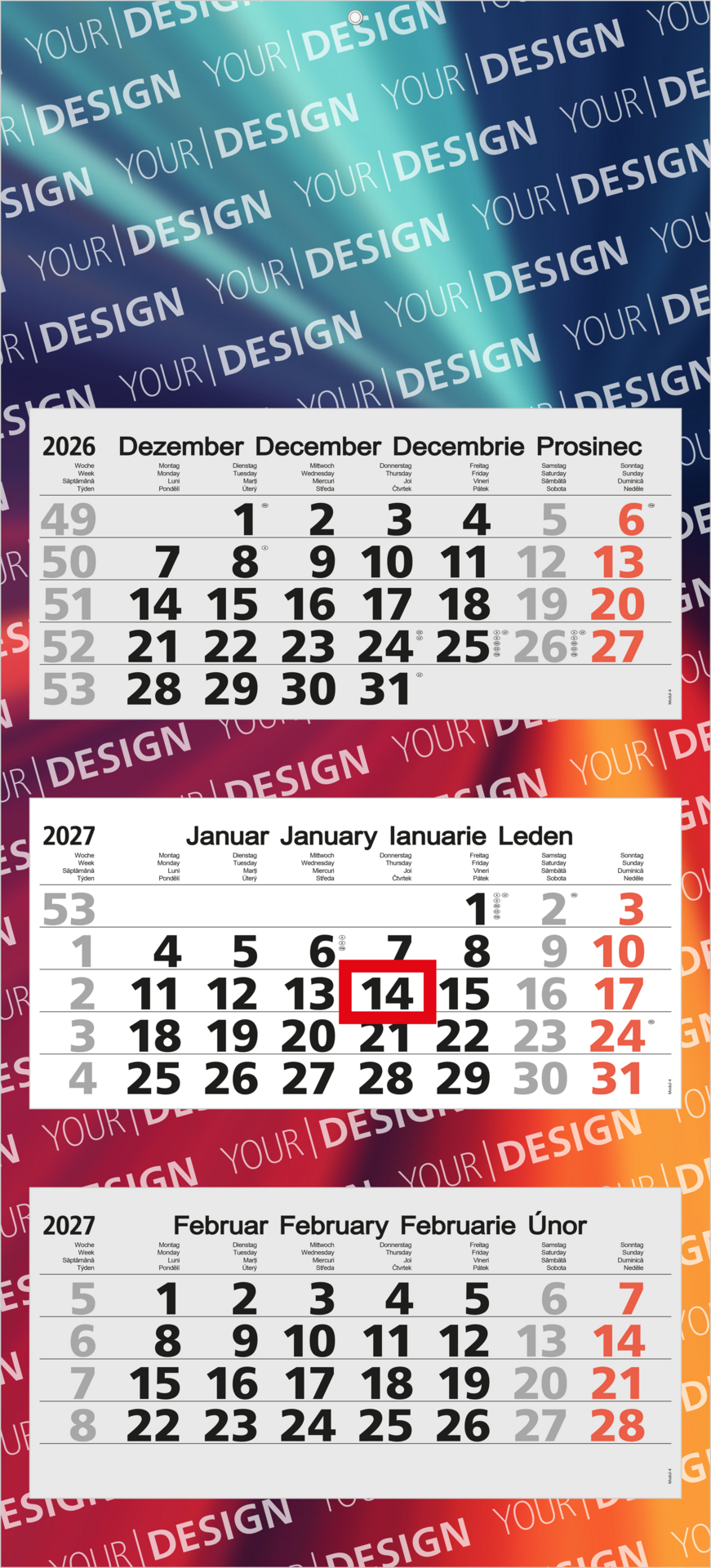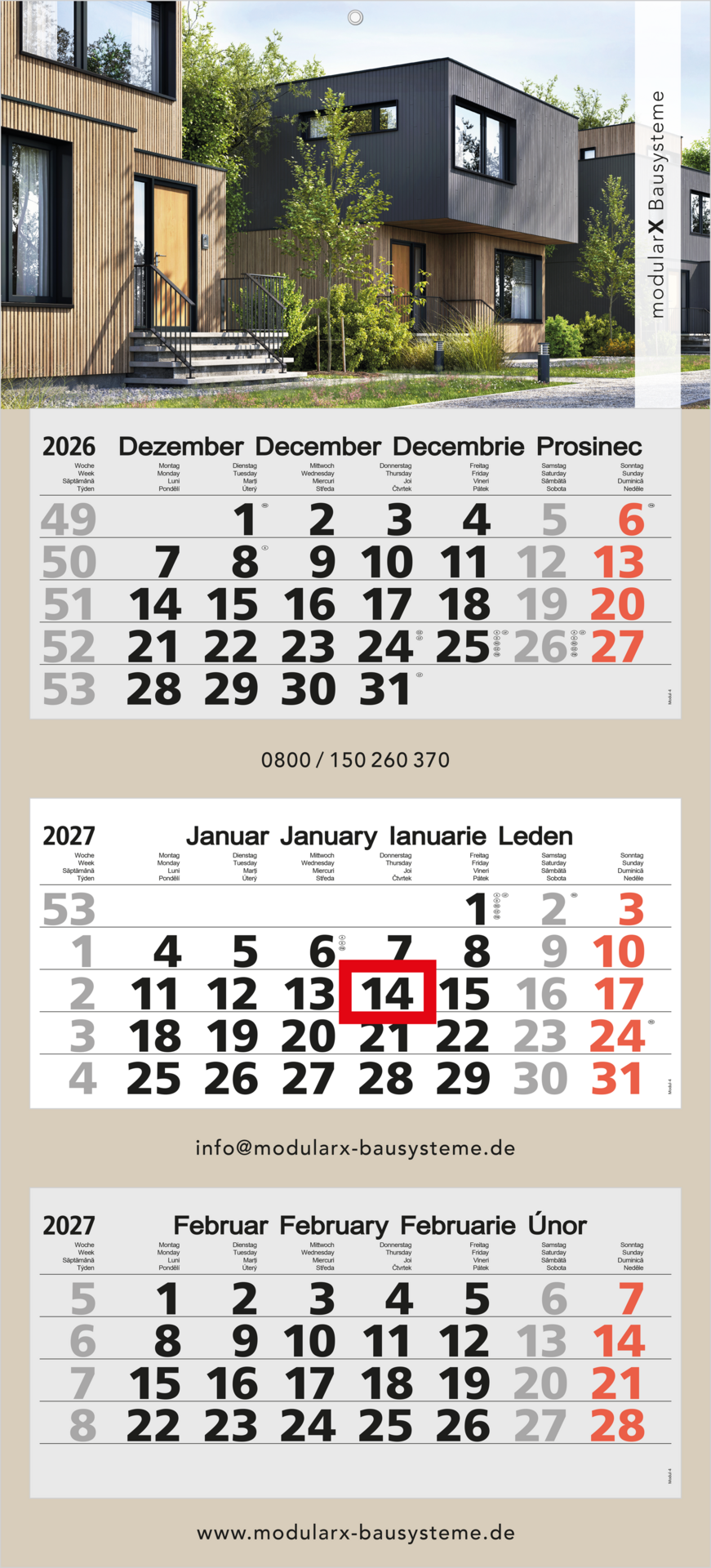 Der Modul 3 Mehrblock ist ein flexibler und vielseitiger 3-Monatskalender, der exakt auf Ihre Anforderungen zugeschnitten wird. Wählen Sie aus einer Vielzahl an Sprachen, Feiertagsoptionen und Farben, um ein einzigartiges Produkt zu schaffen. Mit einer vollständig bedruckbaren Rückwand und einer hochwertigen Verarbeitung bietet dieser Kalender eine ideale Kombination aus Funktionalität und Werbewirkung. Hergestellt in Deutschland, überzeugt er durch Qualität und Anpassungsfähigkeit.