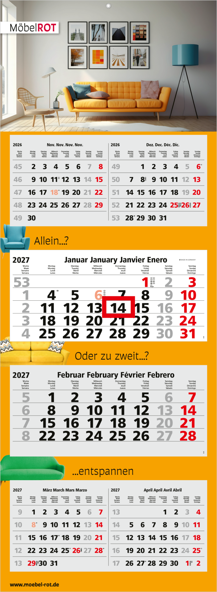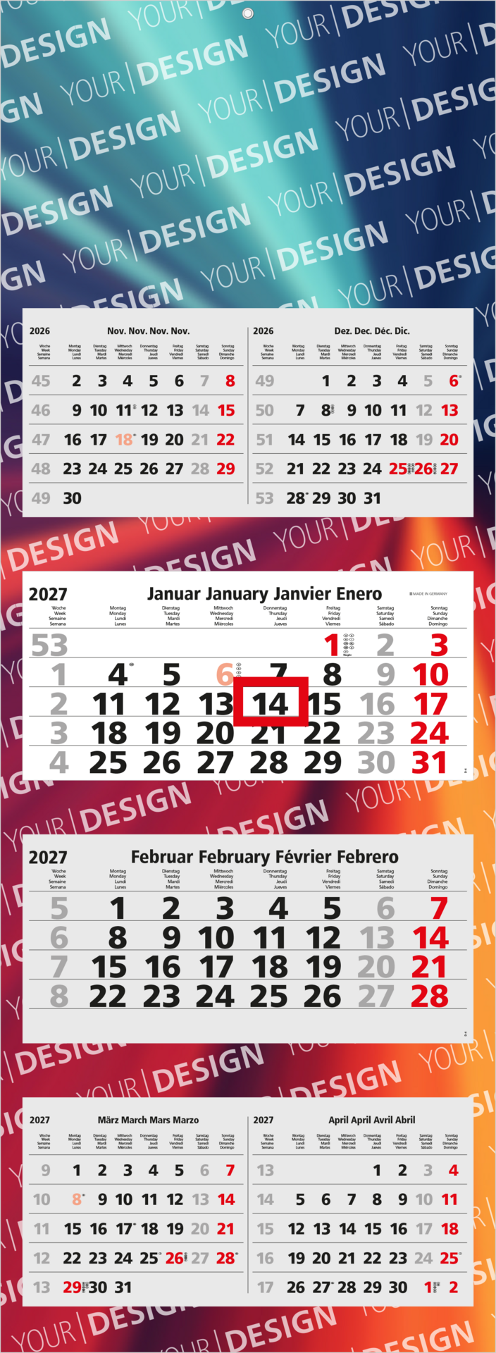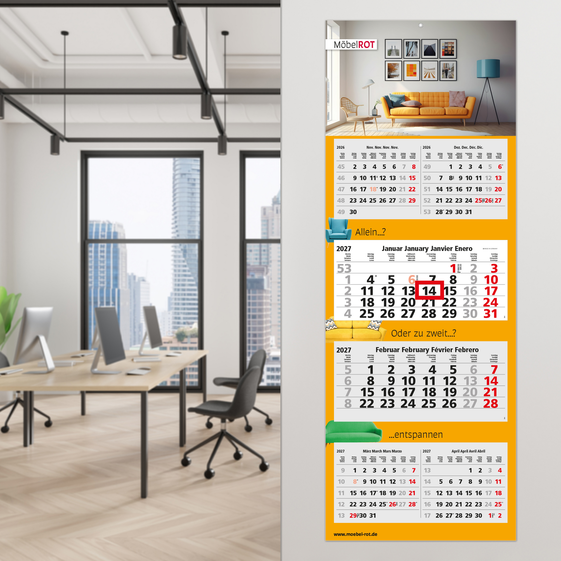 Der Multi 6 bietet Übersichtlichkeit und Werbewirkung auf höchstem Niveau. Mit seinem 6-Monatskalendarium, das einen großen laufenden und Folgemonat umfasst, sowie einer großzügigen Werbefläche eignet sich dieser Kalender ideal für Unternehmen, die ihre Botschaften prominent platzieren möchten. Ergänzt durch hochwertige Druckoptionen und eine portooptimierte Verarbeitung, ist der Multi 6 eine vielseitige Wahl für effektive Werbung. „Made in Germany“ – für bewährte Qualität und Verlässlichkeit.