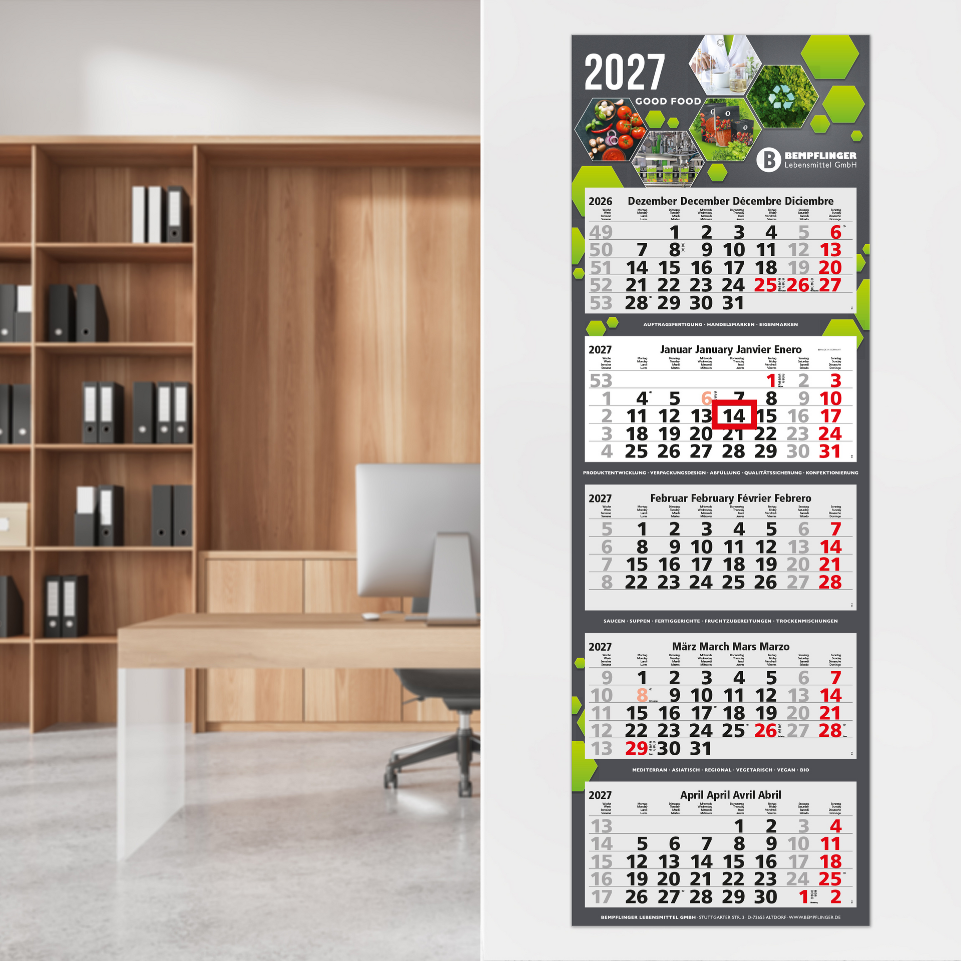 Der Penta Light 5 Bestseller ist ein vielseitiger Mehrblock-5-Monatskalender, der Funktionalität und Werbewirkung ideal kombiniert. Das viersprachige Kalendarium (Deutsch/Englisch/Französisch/Spanisch) mit rot hervorgehobenen Sonn- und Feiertagen sorgt für eine übersichtliche Organisation. Die perforierten Kalenderblöcke und die faltbare Rückwand ermöglichen eine portooptimierte Versendung. Dank der großzügigen Werbefläche auf der kompletten Rückwand und des hochwertigen 4C-Drucks eignet sich der Kalender hervorragend als effektives Werbemittel. „Made in Germany“ – zuverlässig, klar und wirkungsvoll.