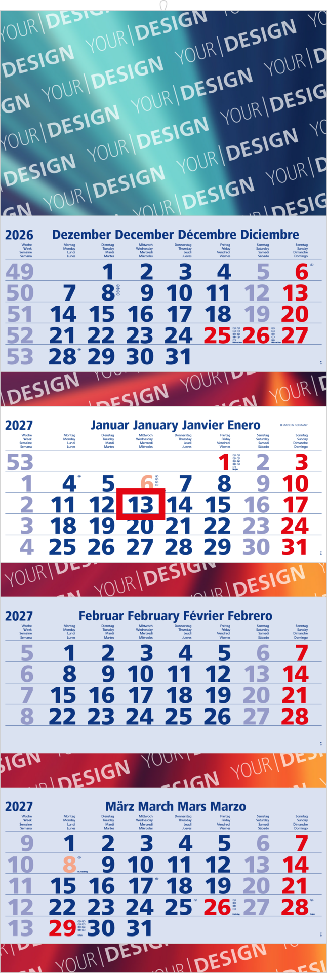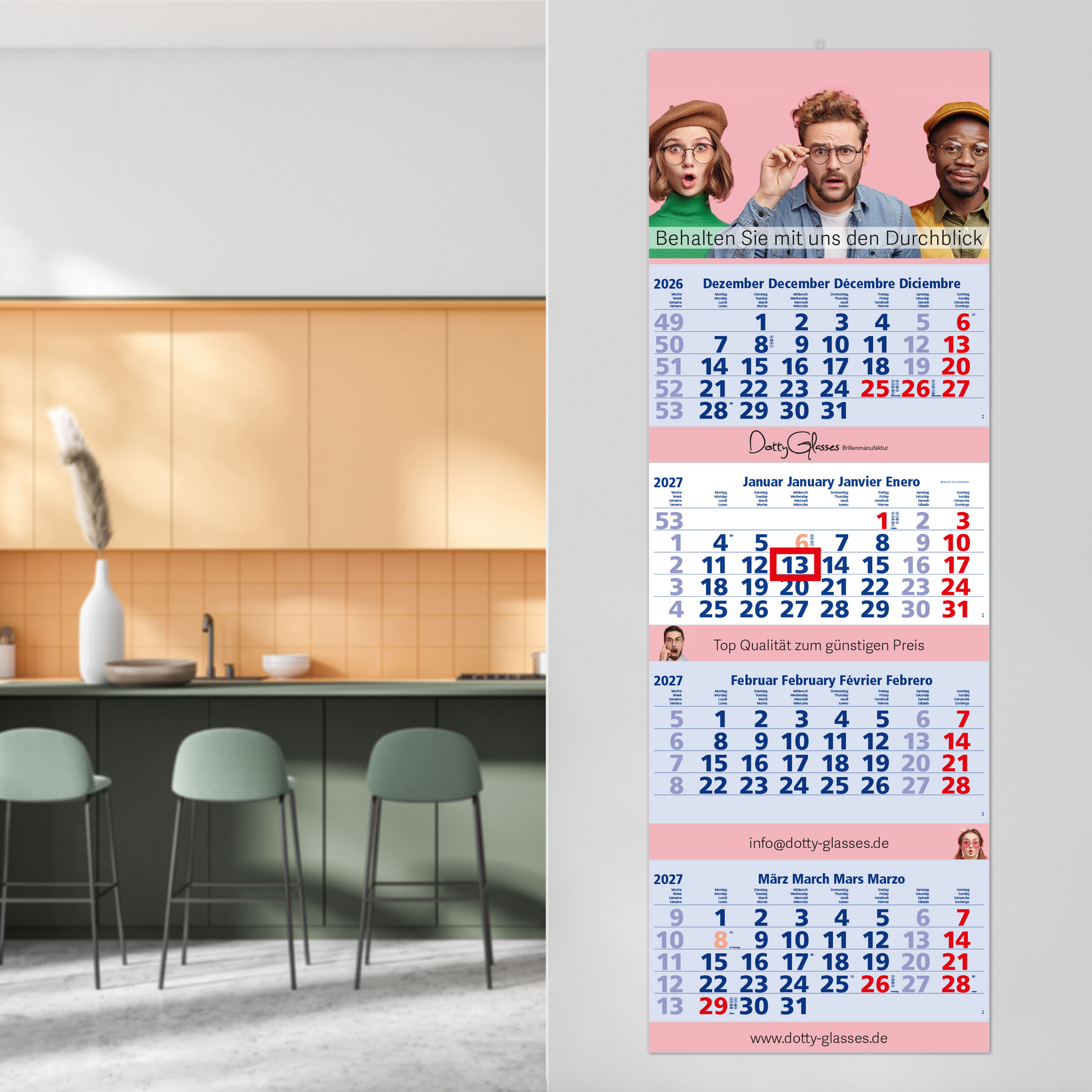 Der Quadro 4 Post kombiniert ein großzügiges Format mit durchdachter Funktionalität und hochwertigem Design. Mit einem viersprachigen Kalendarium in Hell und einer großflächigen Rückwand ist dieser 4-Monatskalender ideal für Unternehmen, die Übersichtlichkeit und effektive Werbung verbinden möchten. „Made in Germany“ – für höchste Ansprüche an Qualität und Präzision.
