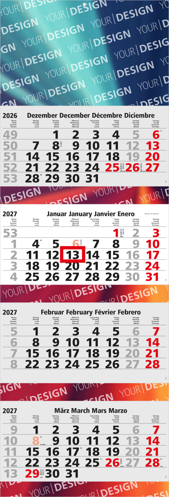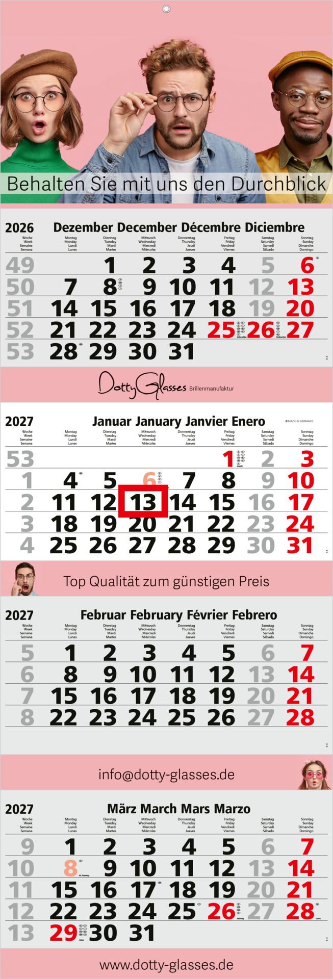 Der Quadro 4 Post kombiniert ein großzügiges Format mit durchdachter Funktionalität und hochwertigem Design. Mit einem viersprachigen Kalendarium in Hell und einer großflächigen Rückwand ist dieser 4-Monatskalender ideal für Unternehmen, die Übersichtlichkeit und effektive Werbung verbinden möchten. „Made in Germany“ – für höchste Ansprüche an Qualität und Präzision.
