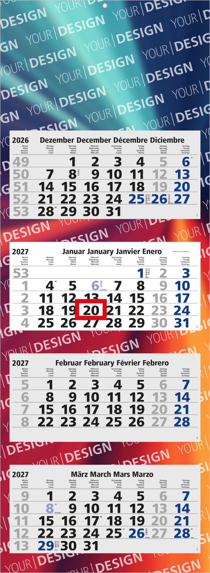 Der Quadro Light 4 ist ein bewährter Mehrblock-4-Monatskalender, der sich durch Funktionalität und klare Übersicht auszeichnet. Mit einem mehrsprachigen Kalendarium und farbig hervorgehobenen Tagen eignet sich dieser Kalender ideal für internationale Zielgruppen. Die perforierten Kalenderblöcke und die faltbare Rückwand ermöglichen eine portooptimierte Versendung. Die komplette Rückwand kann individuell im Offset- oder Druck gestaltet werden, während Sonderoptionen wie ein individuell farbiger Datumsschieber und Übersichtskalendarien zusätzlichen Gestaltungsspielraum bieten. „Made in Germany“ – hochwertig, flexibel und zuverlässig.