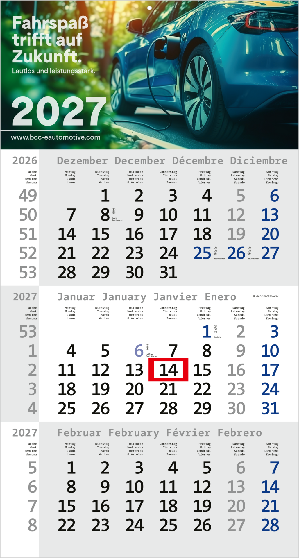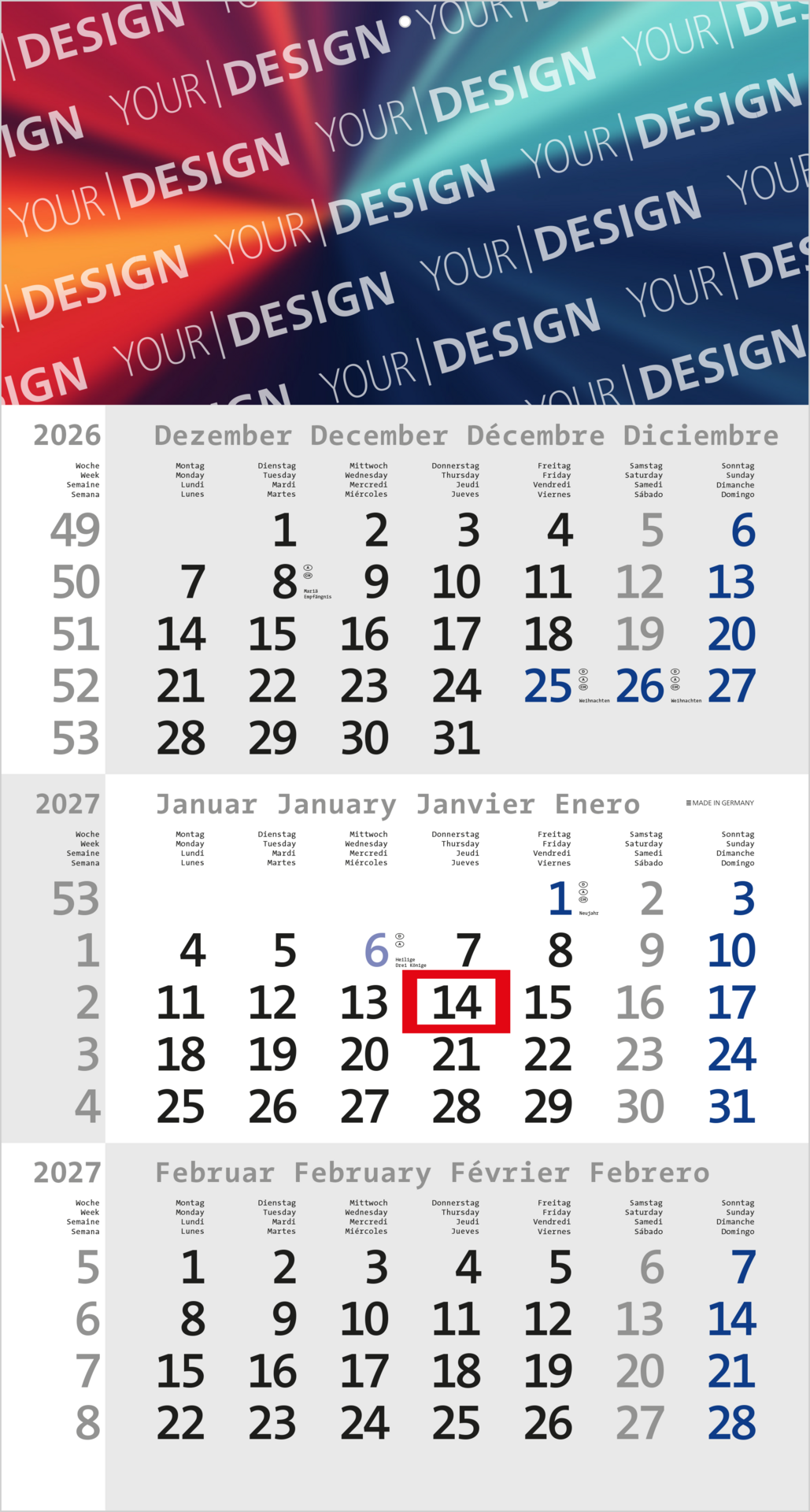 Der Rational 3 ist ein durchdachter 3-Monatskalender, der klassischen Aufbau mit moderner Typografie kombiniert. Das farbige viersprachige Kalendarium (Deutsch/Englisch/Französisch/Spanisch) hebt Sonn- und Feiertage übersichtlich hervor und sorgt für eine klare Struktur. Der rote Datumsschieber erleichtert die Navigation. Mit einer großzügigen Werbefläche am Kopf, die flexibel im Offset- oder Druck gestaltet werden kann, sowie weiteren Optionen ist der Rational 3 ein hochwertiges und vielseitiges Werbemittel. „Made in Germany“ – funktional und stilvoll.