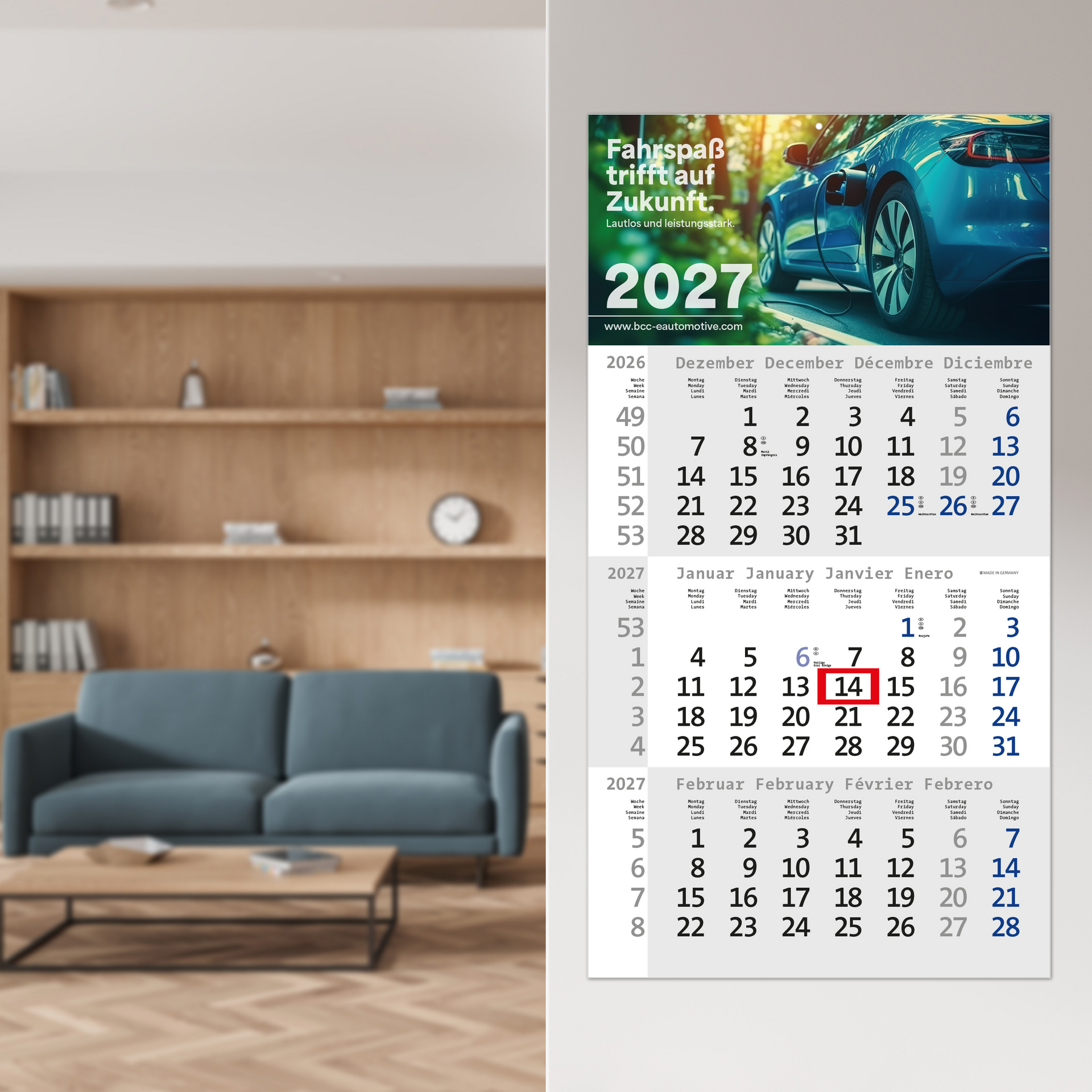 Der Rational 3 verbindet klassische Gestaltung mit einem modernen viersprachigen Kalendarium. Mit seiner klaren Struktur, einer großzügigen Werbefläche und vielseitigen Anpassungsmöglichkeiten eignet sich dieser 3-Monatskalender ideal für Unternehmen, die ein stilvolles und praktisches Werbemittel suchen. Hergestellt in Deutschland, bietet der Rational 3 Qualität und Flexibilität.