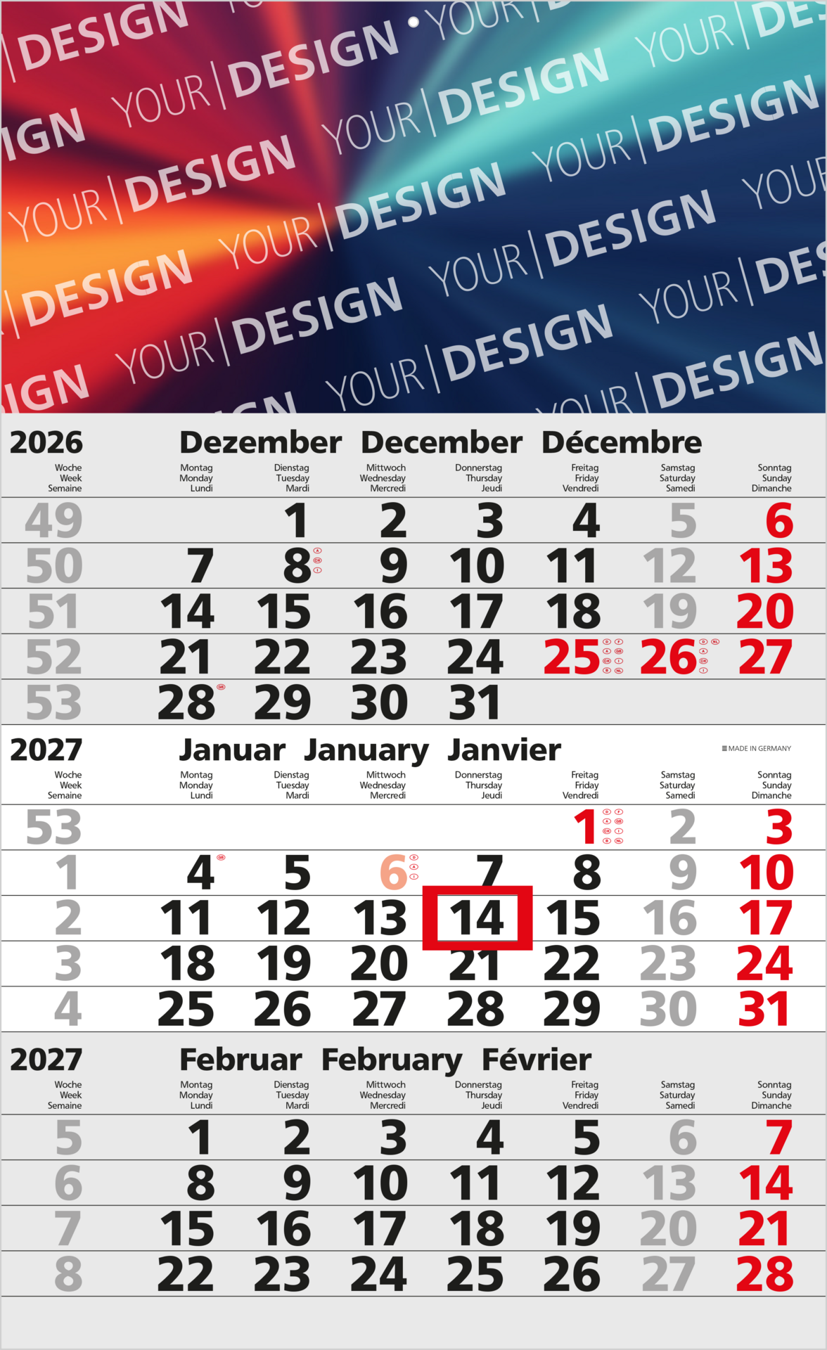 Der Einblatt-3-Monatskalender Solid 3 Bestseller ist ein bewährter Werbekalender für den preisbewussten Einsatz. Er kombiniert funktionale Gestaltung mit zuverlässiger Qualität „Made in Germany“ und eignet sich ideal für große Auflagen. Das farbige Kalendarium zeigt drei Monate übersichtlich auf einem Blatt und ist dreisprachig in Deutsch, Englisch und Französisch ausgeführt. Sonn- und Feiertage sind zur besseren Orientierung rot hervorgehoben. Die klassische, gut lesbare Schrift unterstützt eine schnelle Terminübersicht im Arbeitsalltag. Für die individuelle Markenkommunikation steht eine großzügige Werbefläche im Kopfbereich zur Verfügung. Der 4-farbige CMYK-Druck ist bereits im Komplettpreis enthalten, ebenso der rote Datumsschieber als funktionales Ausstattungsmerkmal. Damit bietet der Solid 3 ein attraktives Gesamtpaket für Werbezwecke.