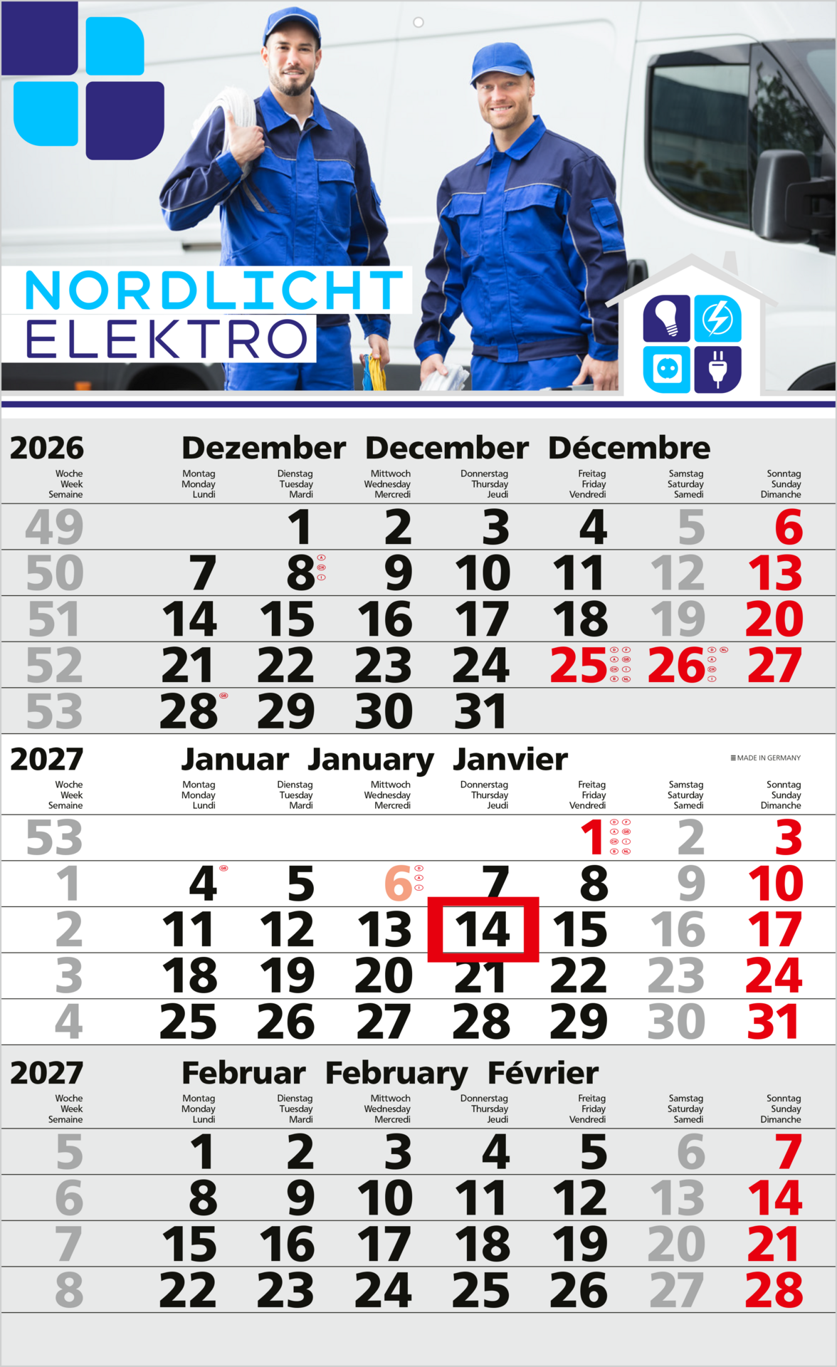 Der Solid 3 Bestseller ist ein klassischer Einblatt-3-Monatskalender und zählt zu den meistverkauften Werbekalendern. Er verbindet Übersichtlichkeit, solide Verarbeitung und attraktive Konditionen inklusive Werbedruck – ideal für Unternehmen mit hohem Stückbedarf.