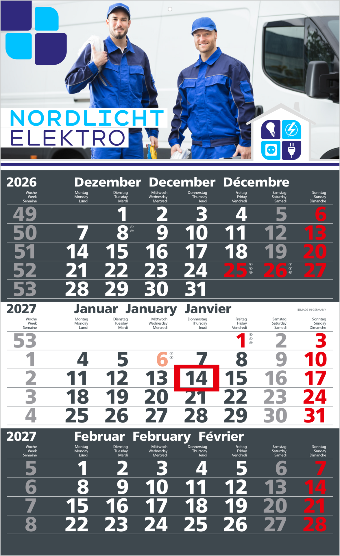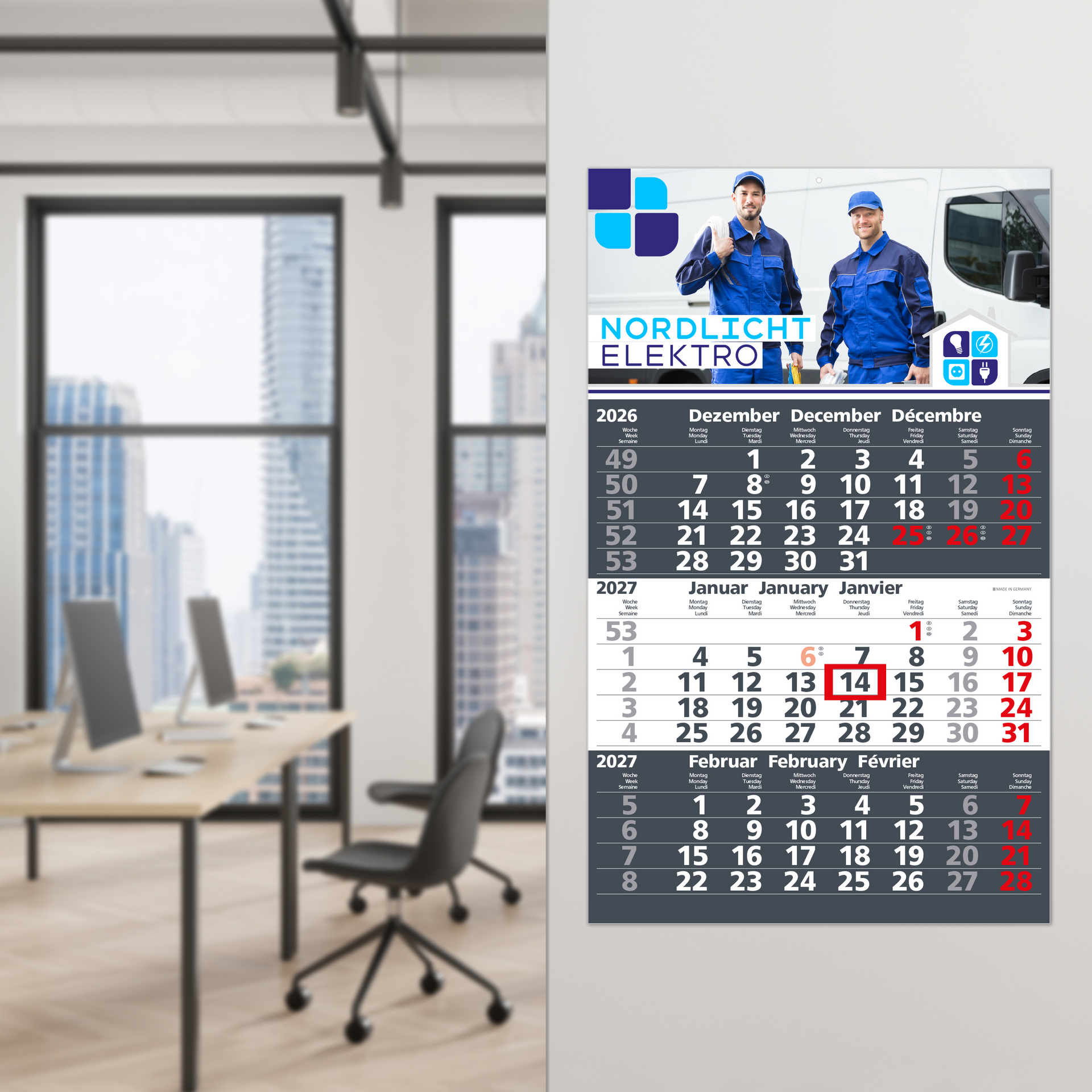 Der Solid 3 ist ein klassischer Einblatt-3-Monatskalender für den Einsatz als Werbekalender im professionellen Umfeld. Er eignet er sich besonders für hohe Auflagen bei gleichzeitig klarer Funktionalität und guter Lesbarkeit. Das farbige Kalendarium ist dreisprachig ausgeführt (Deutsch/Englisch/Französisch) und verwendet eine dicke, klassische Schrift. Sonn- und Feiertage sind in Rot (HKS 14) hervorgehoben, was die Orientierung im Arbeitsalltag erleichtert. Ein roter Datumsschieber ermöglicht eine schnelle Tagesmarkierung. Die Werbeanbringung erfolgt auf dem Kopfteil mit einer großzügigen Druckfläche von 300 × 150 mm. Der Kalender wird in Deutschland produziert.