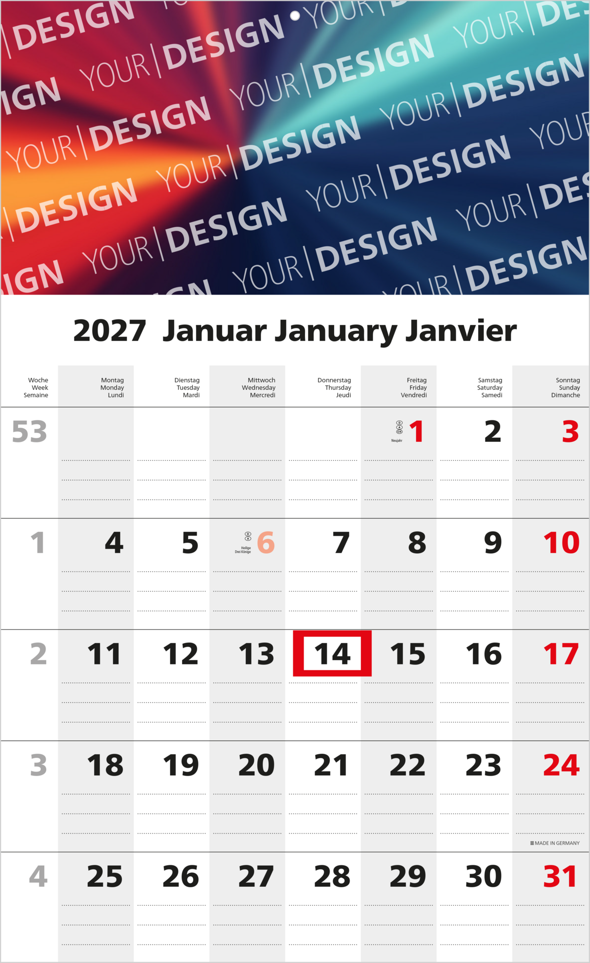Der Solo 1 Bestseller ist ein klassischer Einblatt-Monatskalender für den professionellen Einsatz. Er eignet er sich besonders für Unternehmen, die einen funktionalen Werbekalender mit hoher Sichtbarkeit und praktischem Nutzen suchen.