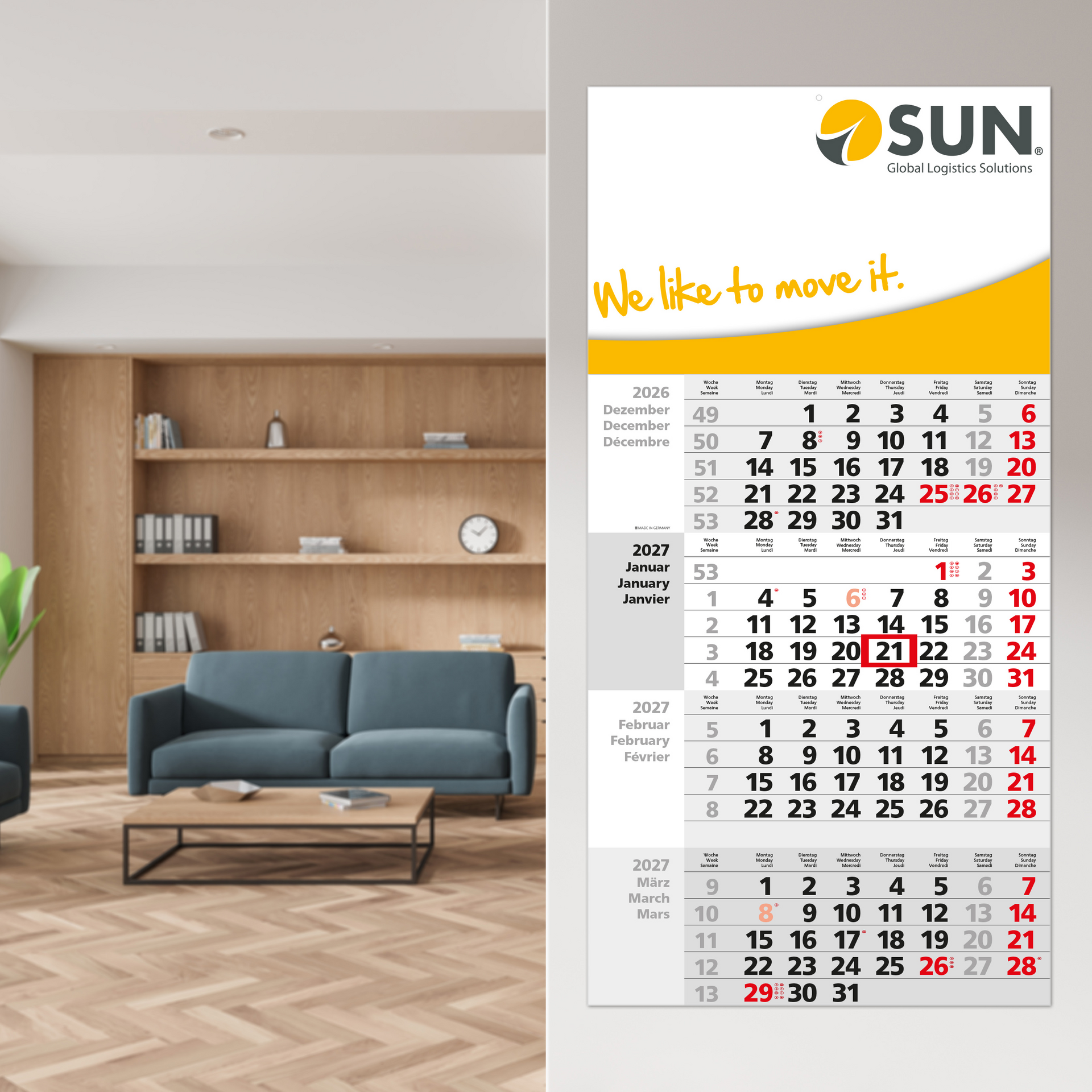 Der Square 4 Post kombiniert modernes Design mit großzügigen Werbemöglichkeiten in einem portooptimierten 4-Monatskalender. Mit seiner extra großen Werbefläche und dem breiten Format von 330 mm bietet er Unternehmen die Möglichkeit, ihre Marke wirkungsvoll zu präsentieren. Perforierte Kalenderblätter und eine faltbare Rückwand machen ihn ideal für den Versand, während das dreisprachige Kalendarium Übersicht und Funktionalität garantiert. Hergestellt in Deutschland, steht der Square 4 Post für Qualität und Effizienz.