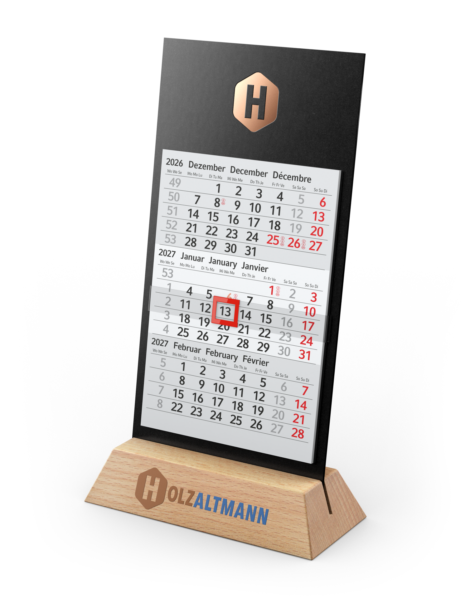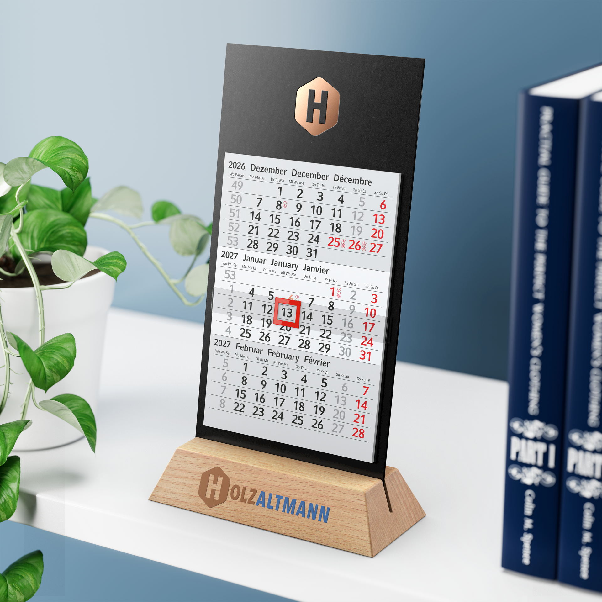 Der Desktop Wood 3 vereint zeitloses Design und hochwertige Materialien in einem Premium-Tischkalender. Der edle Holzaufsteller aus Buchenholz und die schwarze Kartonrückwand mit Prägungsmöglichkeit machen ihn zu einem stilvollen Werbemittel. Mit einem 2-Jahres-Kalendarium, flexibel gestaltbaren Werbeflächen und einer langlebigen Verarbeitung ist dieser Kalender ideal für Unternehmen, die Wert auf Qualität legen.