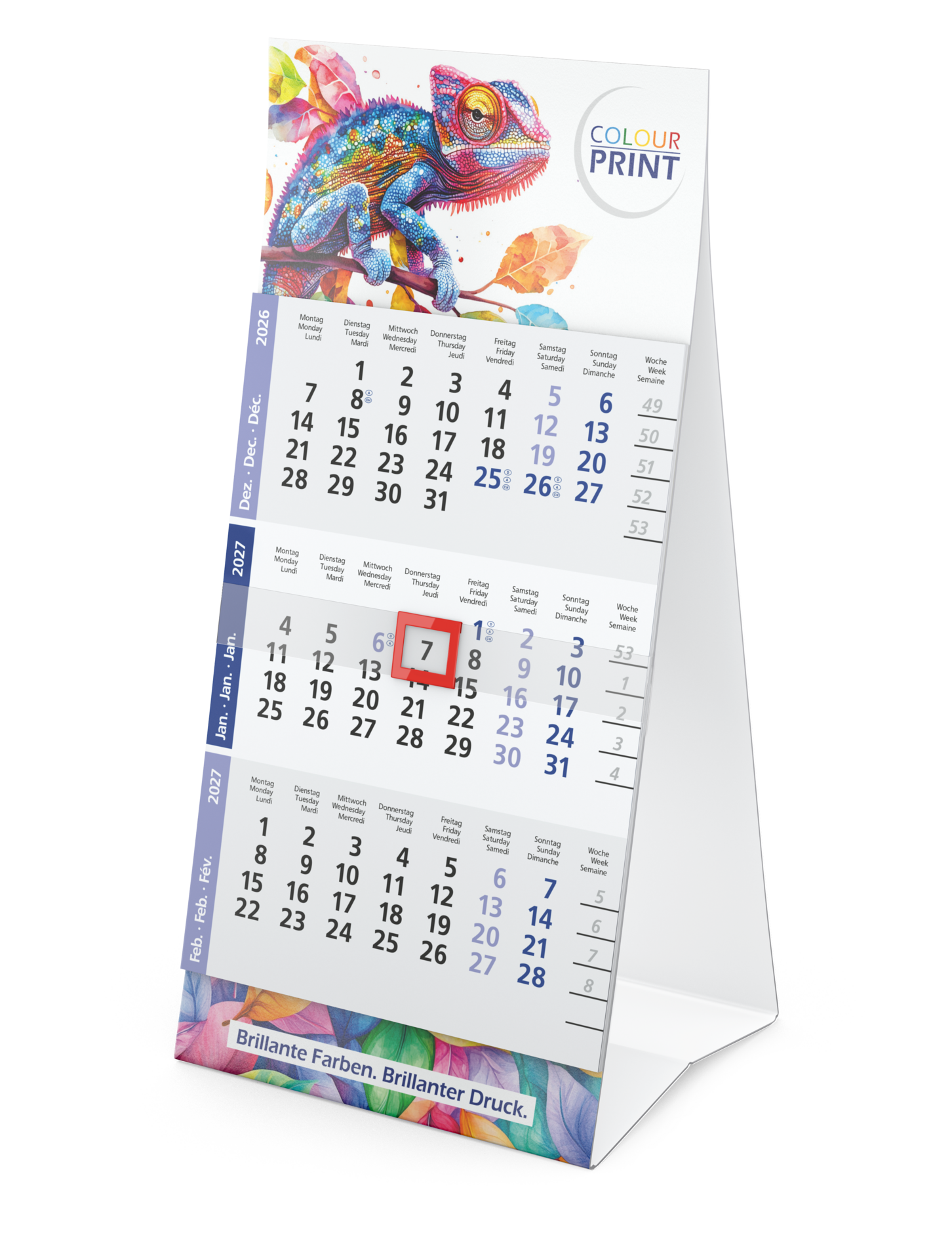 Der Mini 3 ist ein vielseitiger Tisch-Aufstellkalender, der durch seine kompakte Größe und umfangreiche Werbeflächen überzeugt. Mit seinem farbigen Kalendarium, hochwertigen Druckoptionen und einer stabilen Verarbeitung eignet er sich ideal als Werbemittel für Unternehmen, die auf klare Darstellung und individuelles Branding Wert legen. Hergestellt in Deutschland, garantiert der Kalender Qualität und Präzision.