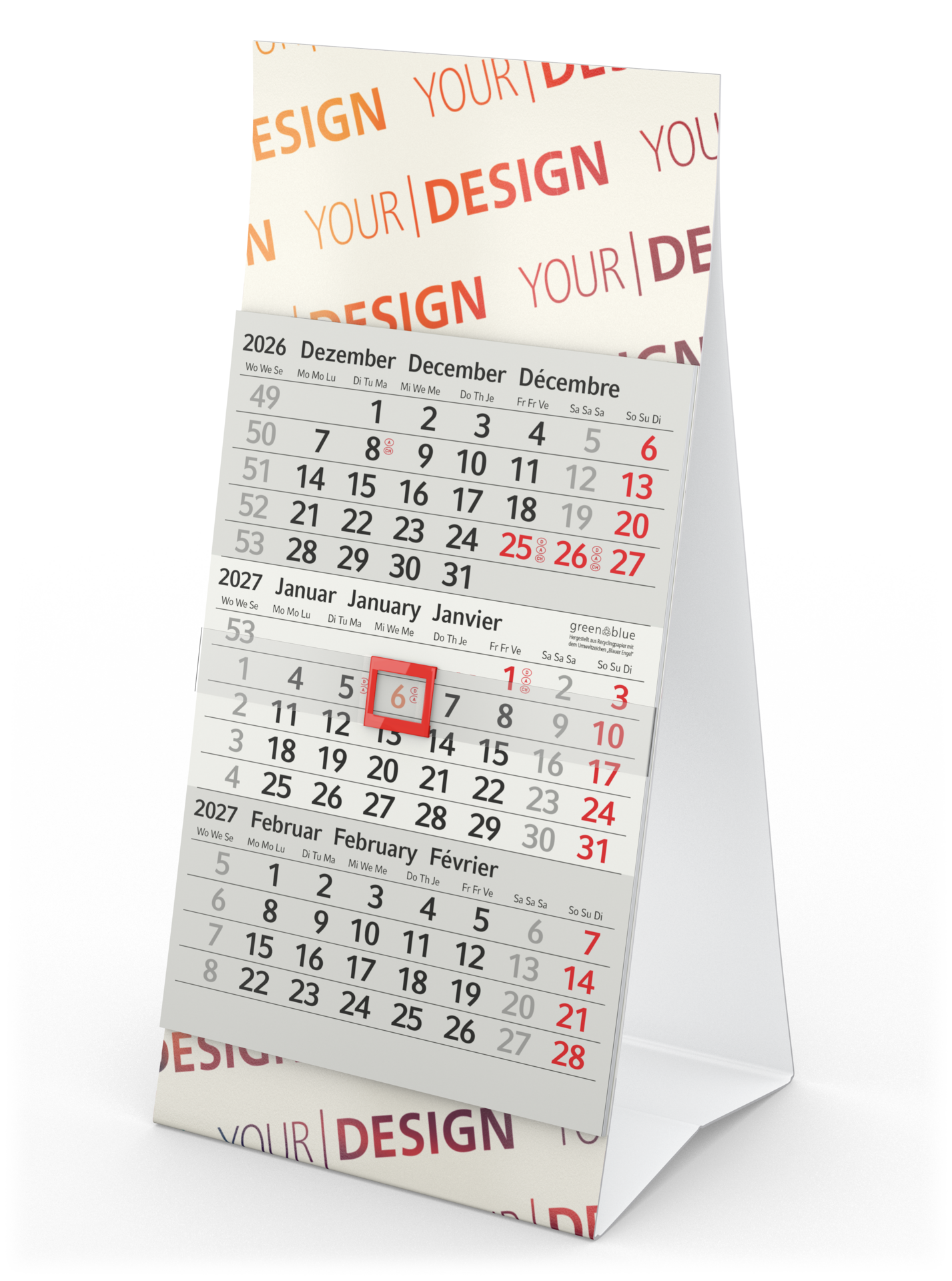 Der Mini 3 green+blue ist die Wahl für Unternehmen, die Wert auf Nachhaltigkeit legen. Dieser Tisch-Aufstellkalender kombiniert ein kompaktes Design mit hochwertigem Recyclingpapier, ausgezeichnet mit dem Umweltzeichen „Blauer Engel“. Mit zusätzlichen Werbeflächen und flexiblen Druckoptionen ist er ein vielseitiges und umweltfreundliches Werbemittel. „Made in Germany“ – nachhaltig und funktional.