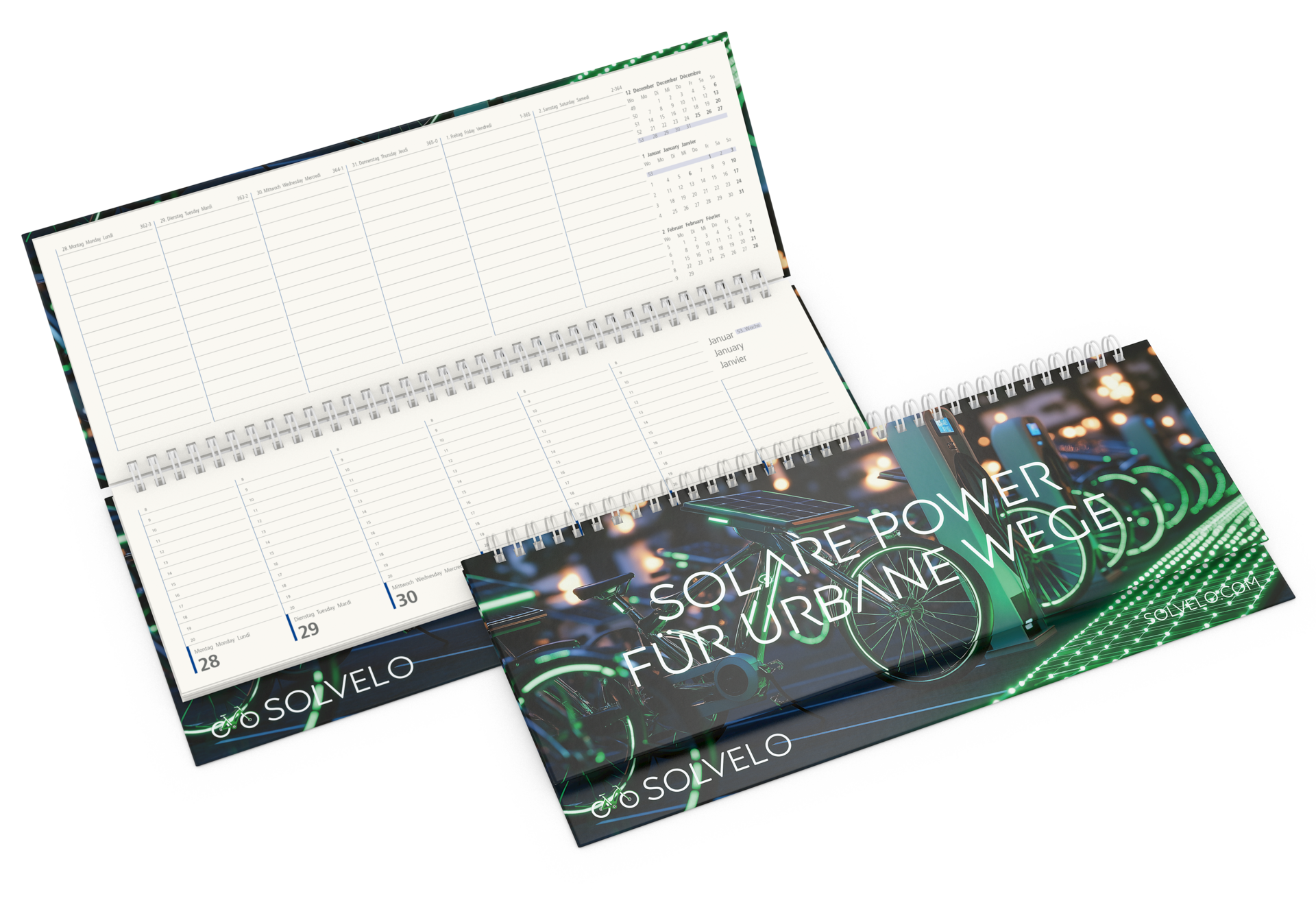 Der Compact green+blue ist der Tisch-Querkalender für Unternehmen, die Wert auf Nachhaltigkeit und Funktionalität legen. Mit 112 Seiten bietet er eine praktische Wochenübersicht auf zwei Seiten. Das dreisprachige Kalendarium (Deutsch, Englisch, Französisch) hebt Sonn- und Feiertage in Blau (PMS 286) hervor und enthält eine Stundeneinteilung von 8 bis 20 Uhr auf dem unteren Blatt sowie einen Notizbereich und eine 3-Monats-Übersicht auf dem oberen Blatt. Mit dem Kalendarium aus Recyclingpapier, ausgezeichnet mit dem Umweltzeichen „Blauer Engel“, steht dieser Kalender für höchste Umweltstandards. Die individuelle Werbefläche auf Ober- und Unterdeckel bietet Platz für die Markenbotschaft, die im 4C-Druck realisiert wird. Hergestellt in Deutschland – die nachhaltige Wahl für Werbekampagnen.