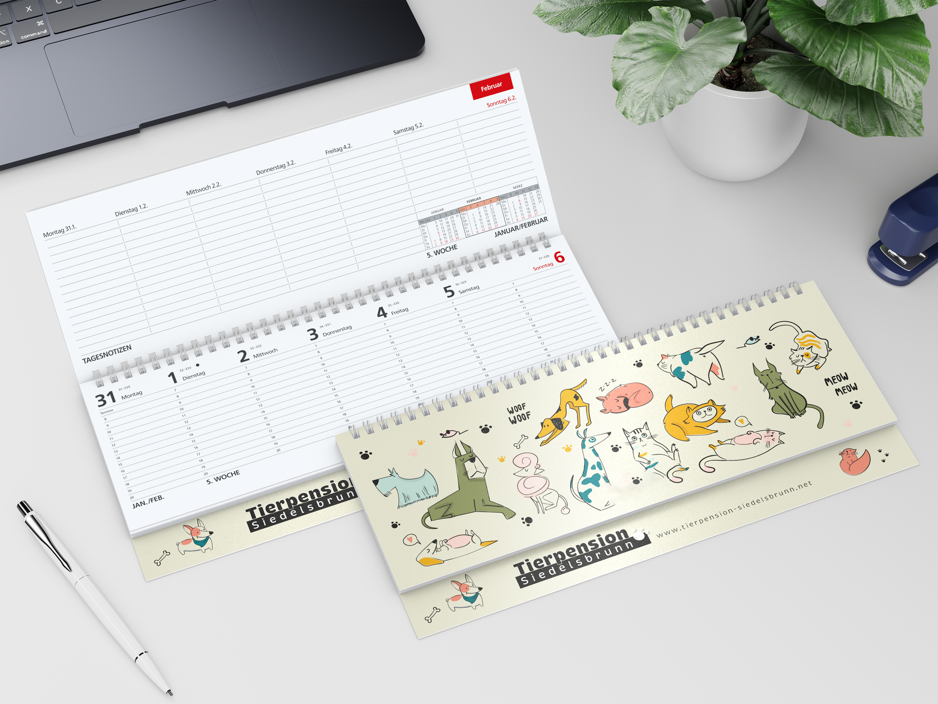 Der Tisch-Querkalender Tempo ist ein hochwertiges Premium-Modell für professionelle Terminplanung und effektive Werbewirkung. Mit einem großzügigen Format und 128 Seiten bietet er eine strukturierte Wochenübersicht auf zwei Seiten. Das Kalendarium hebt Sonntage (und Feiertage) in Rot (HKS 14) hervor. Die Stundeneinteilung von 7 bis 20 Uhr auf dem unteren Blatt ermöglicht eine präzise Planung, während das obere Blatt Notizraum und eine praktische 3-Monats-Übersicht bietet. Der Kalenderblock wird durch eine robuste Wire-O-Bindung in Weiß gehalten. Der Einband kann individuell gestaltet werden, wobei eine breite Palette an Materialien und Veredelungsoptionen zur Verfügung steht. Ideal für Unternehmen, die Funktionalität und hochwertige Markenpräsenz verbinden möchten – „Made in Germany“.