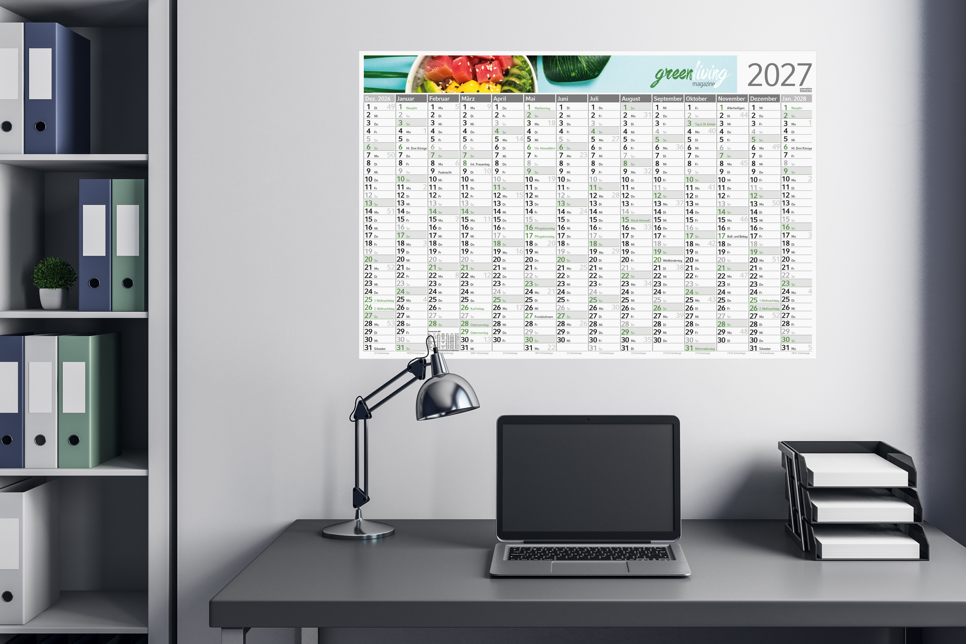 Der Wandplaner Horizont green+blue vereint klassische Funktionalität mit besonderer Umweltfreundlichkeit. Gefertigt aus Recyclingpapier, ausgezeichnet mit dem Umweltzeichen „Blauer Engel“, ist er die nachhaltige Wahl für Unternehmen. Das großzügige Format von 980 × 660 mm bietet viel Raum für eine übersichtliche Planung. Das 14-monatige Kalendarium (Dezember bis Januar) ist einsprachig in Deutsch und überzeugt durch seine farbliche Gestaltung, wobei Sonn- und Feiertage besonders hervorgehoben werden können. Eine individuell gestaltbare Werbefläche am Kopf des Planers macht ihn zu einem perfekten Werbemittel. Der hochwertige 4C-Druck ist inklusive. „Made in Germany“.