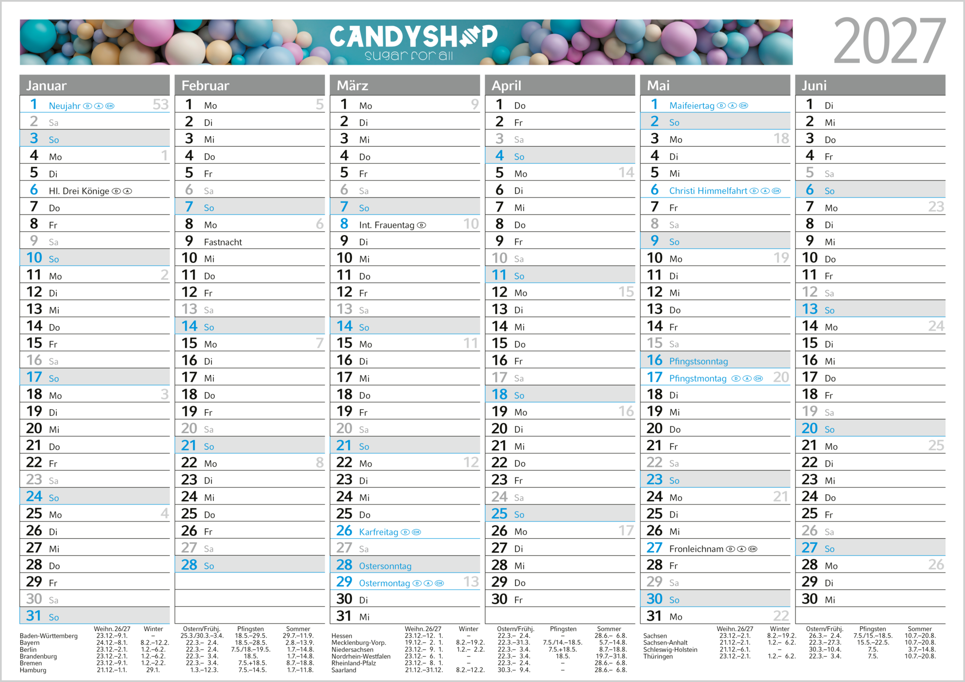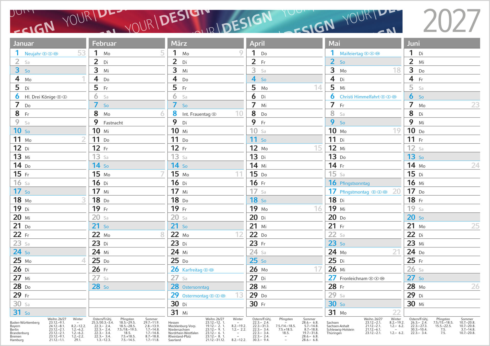 Der Wandplaner Perfect ist eine praktische und übersichtliche Planungshilfe für das ganze Jahr. Der Tafelkalender ist beidseitig bedruckt und zeigt jeweils 6 Monate pro Seite, ergänzt durch eine helle Jahreszahl (hellgrau) und farblich hervorgehobene Sonn- und Feiertage. Das einsprachige Kalendarium (Deutsch) sorgt für eine klare und intuitive Darstellung. Hergestellt aus stabilem weißem Karton, ist der Wandplaner langlebig und robust. Die Werbefläche am Kopf links neben der Jahreszahl auf jeder Seite bietet ausreichend Platz für die individuelle Gestaltung in hochwertigem 4C-Druck. „Made in Germany“ – Qualität und Funktionalität perfekt kombiniert.