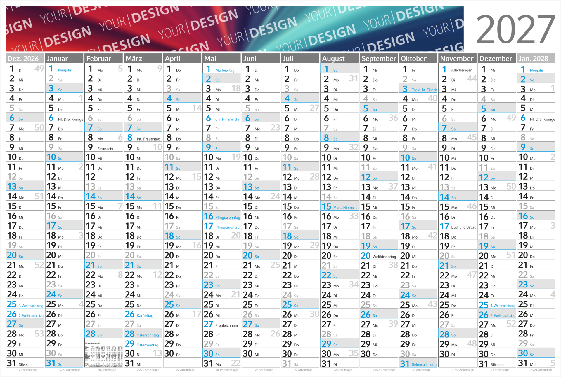 Der Wandplaner Whiteboard bietet eine innovative Kombination aus Funktionalität und Flexibilität. Dank der hochglänzenden Star-Beschichtung ist er trocken abwischbar und kann immer wieder mit Folienstiften beschriftet werden – perfekt für wechselnde Termine und Notizen. Das großzügige Format von 980 × 660 mm und das 14-monatige Kalendarium (Dezember bis Januar) sorgen für Übersichtlichkeit und eine professionelle Optik. Sonn- und Feiertage sind farblich hervorgehoben, und die Jahreszahl ist dezent in Anthrazit gehalten. Die individuell gestaltbare Werbefläche am Kopf macht ihn zu einem effektiven Werbemittel. Hergestellt aus stabilem weißen Karton mit hochwertigem 4C-Offsetdruck, ist der Wandplaner Whiteboard ein Qualitätsprodukt „Made in Germany“.