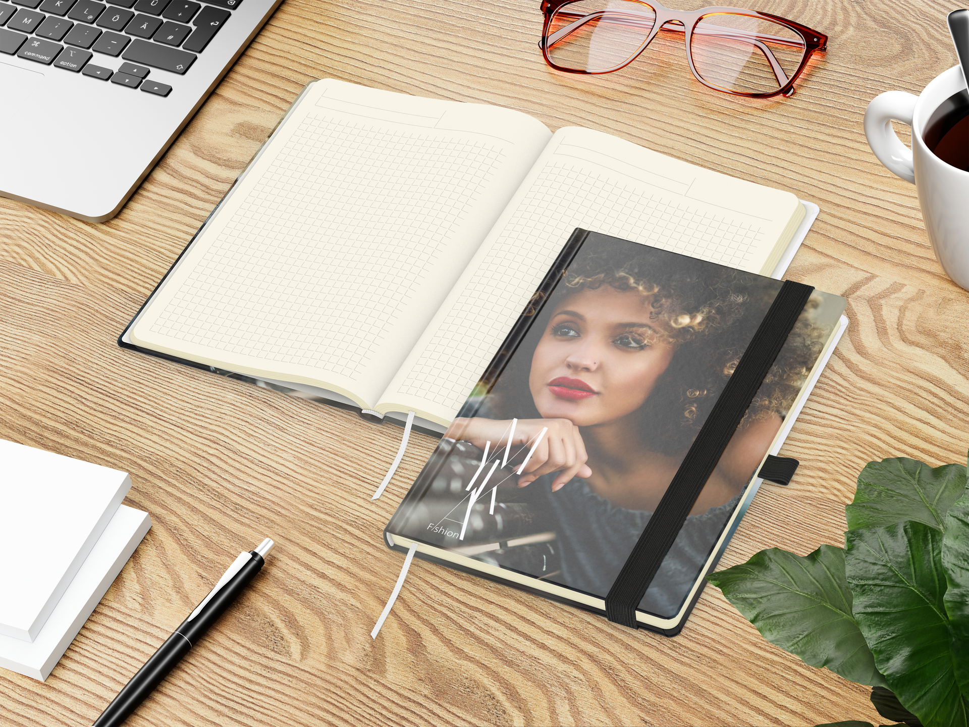 Das Match-Book Cover-Star Bestseller ist ein klassisches Business-Notizbuch mit hochwertiger Hardcover-Verarbeitung und umfassender Ausstattung. Es bietet viel Platz für Notizen und überzeugt durch seine langlebige Qualität sowie eine vollflächig nutzbare Werbefläche auf dem Einband.
