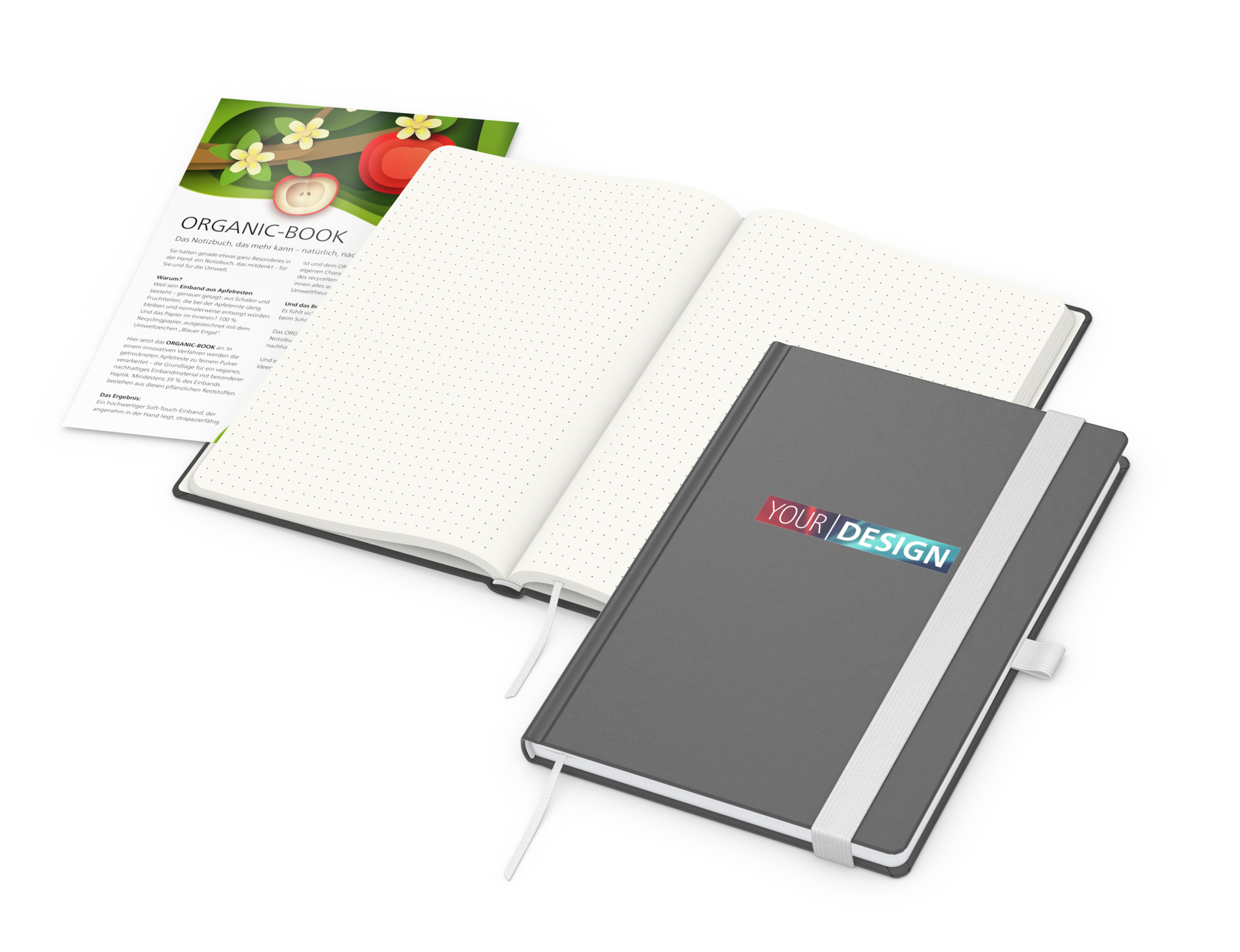 Das Organic-Book verbindet modernes Business-Design mit konsequent nachhaltigen Materialien. Als Werbeartikel-Notizbuch für den professionellen Einsatz überzeugt es durch hochwertige Verarbeitung, umweltfreundliche Inhaltsseiten und einen innovativen Einband aus Apfelleder. Ideal für Unternehmen, die Nachhaltigkeit sichtbar kommunizieren möchten.