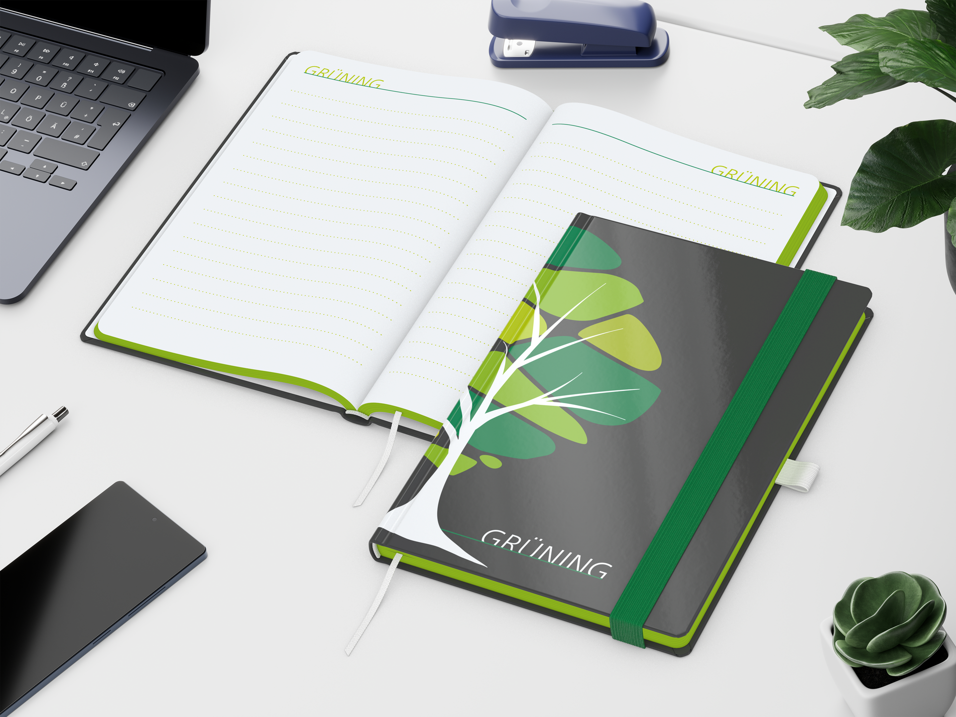 Der Notizbuch-Baukasten: nach Kundenwunsch konfigurierbares Buch; vom Format und der Eckengestaltung über den Einband bis hin zur Lineatur der Notizseiten